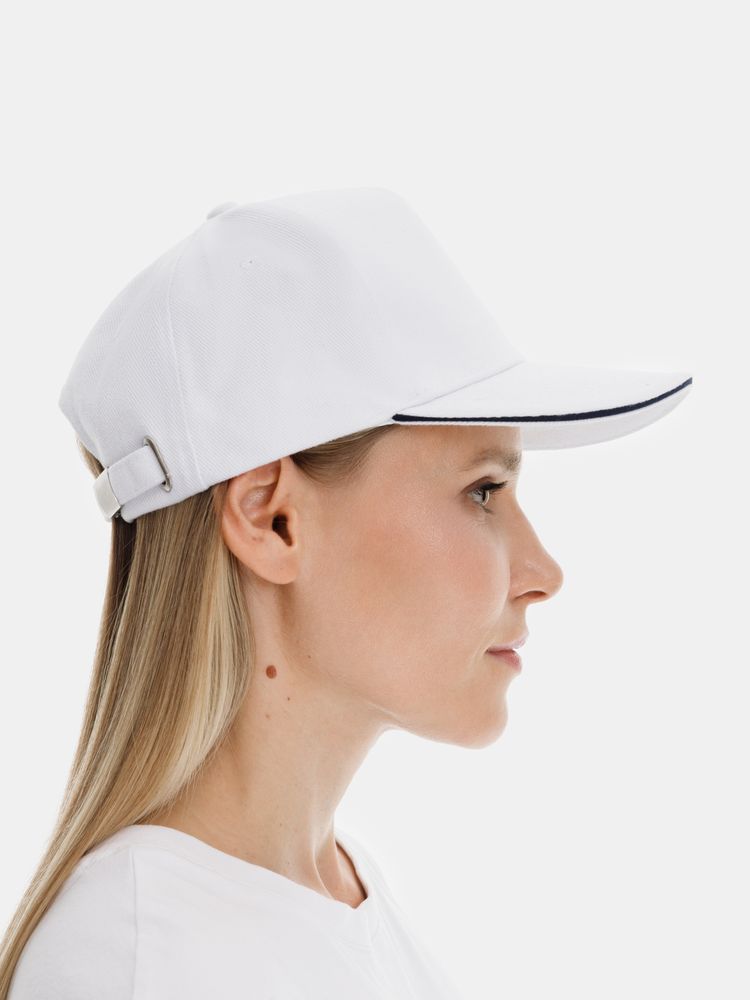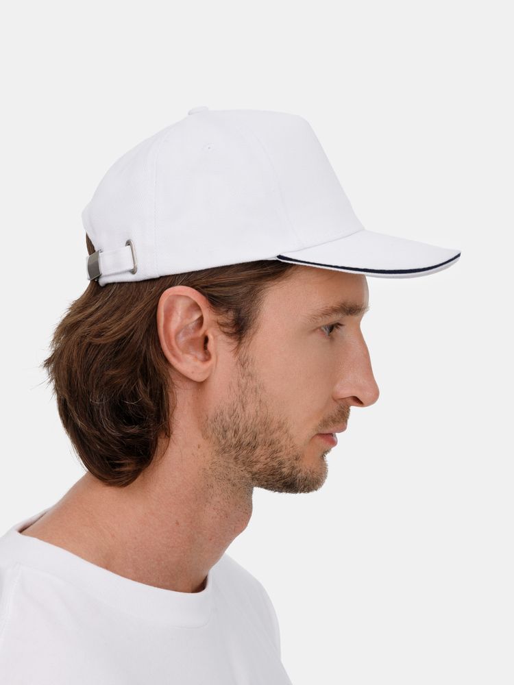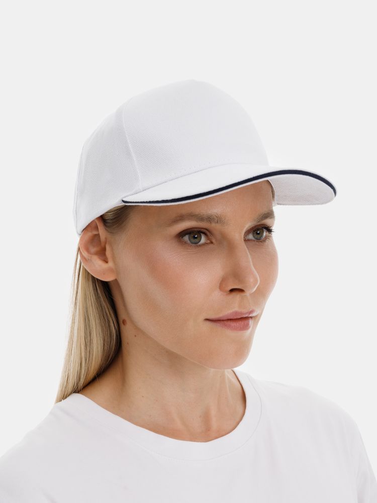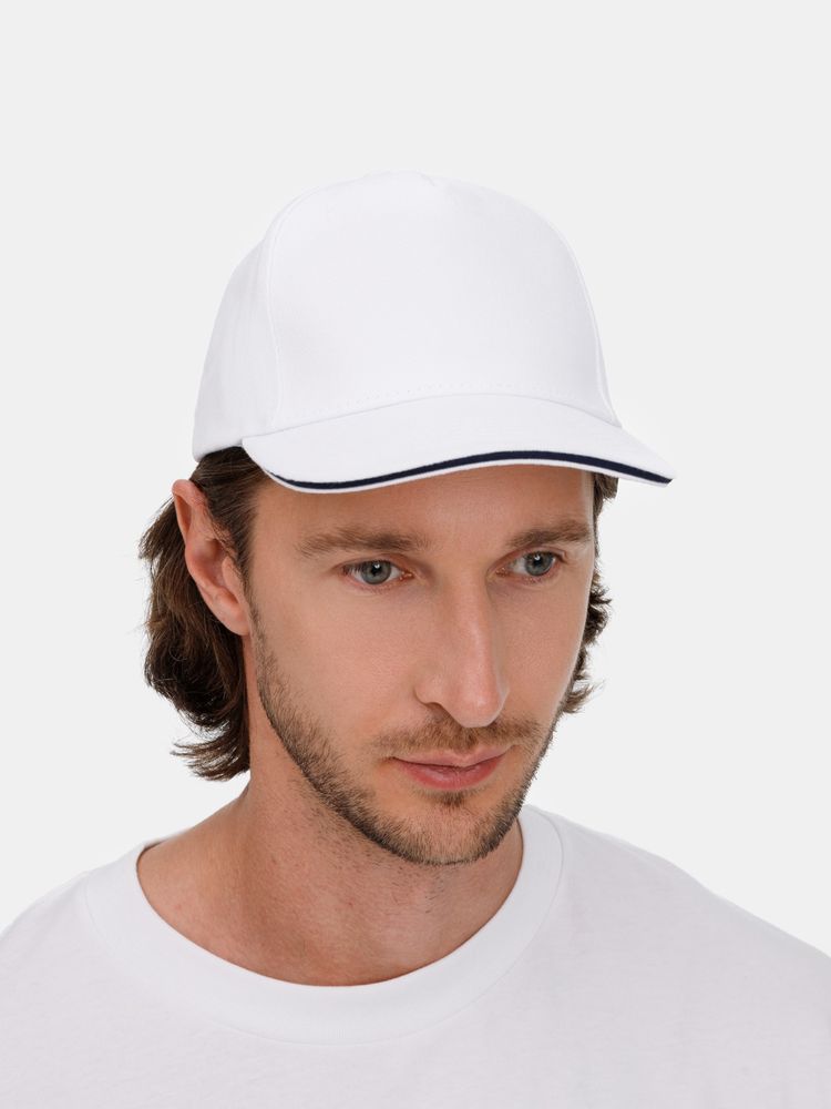 Модель бейсболки с 5-ю клиньями без лобового шва из плотного чесаного хлопка.