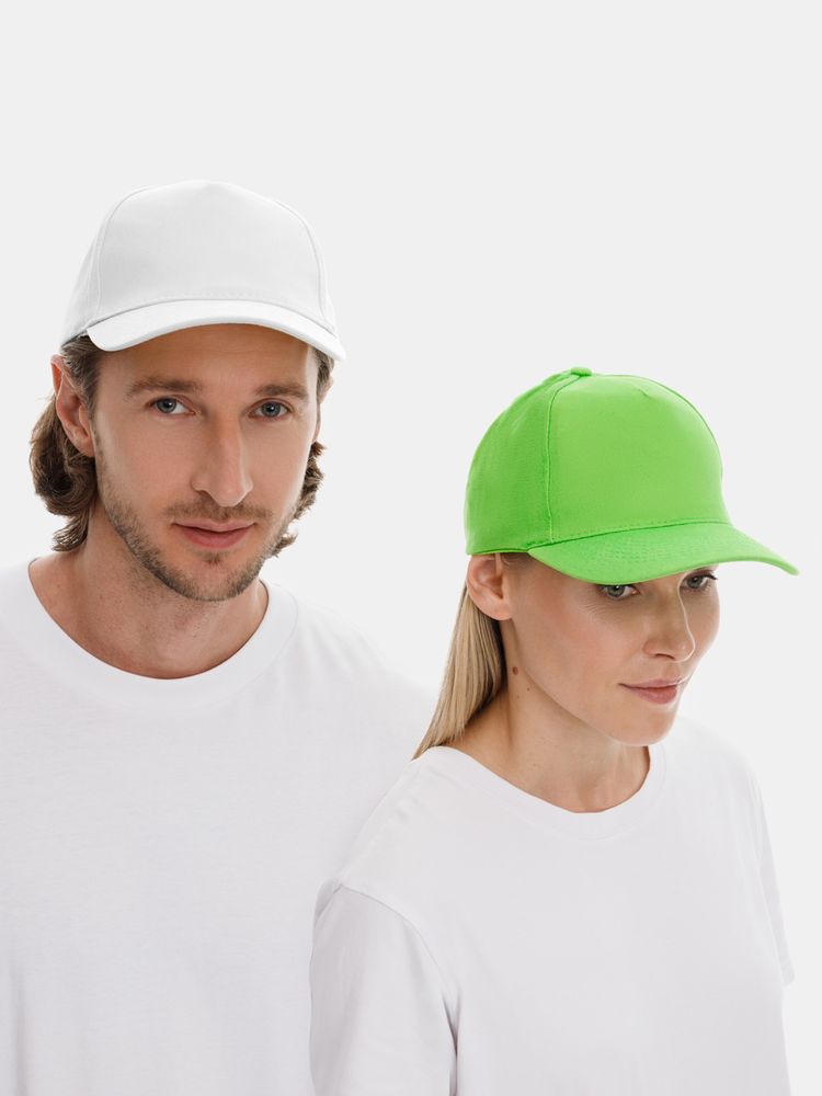 Модель бейсболки с 5-ю клиньями без лобового шва из плотного чесаного хлопка.