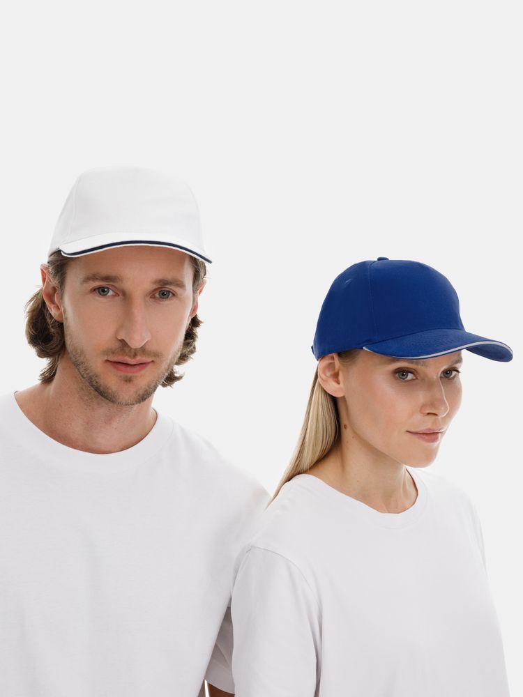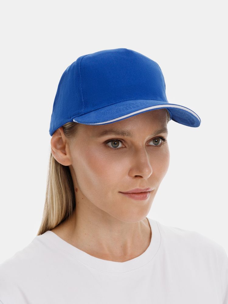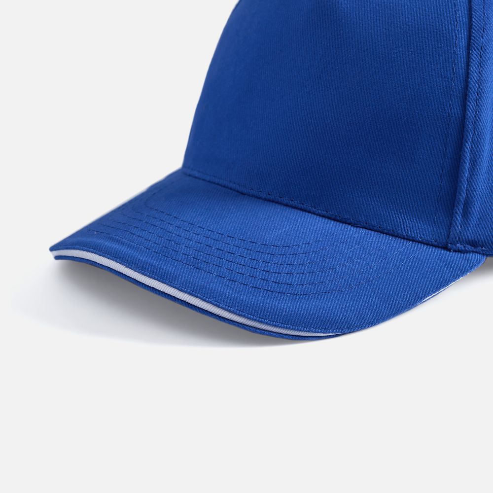 Модель бейсболки с 5-ю клиньями без лобового шва из плотного чесаного хлопка.