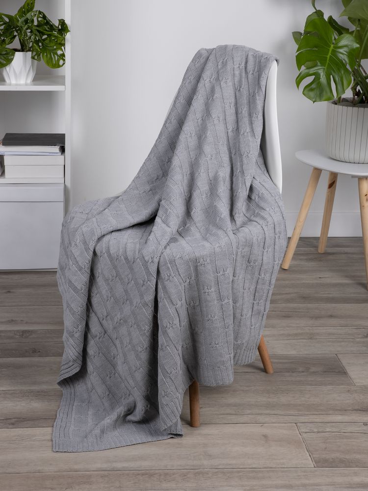 Плед мягкого натурального оттенка с ненавязчивым классическим узором «косы» добавит спокойного шика в интерьер, гармонично впишется в композицию современной гостиной или спальни.