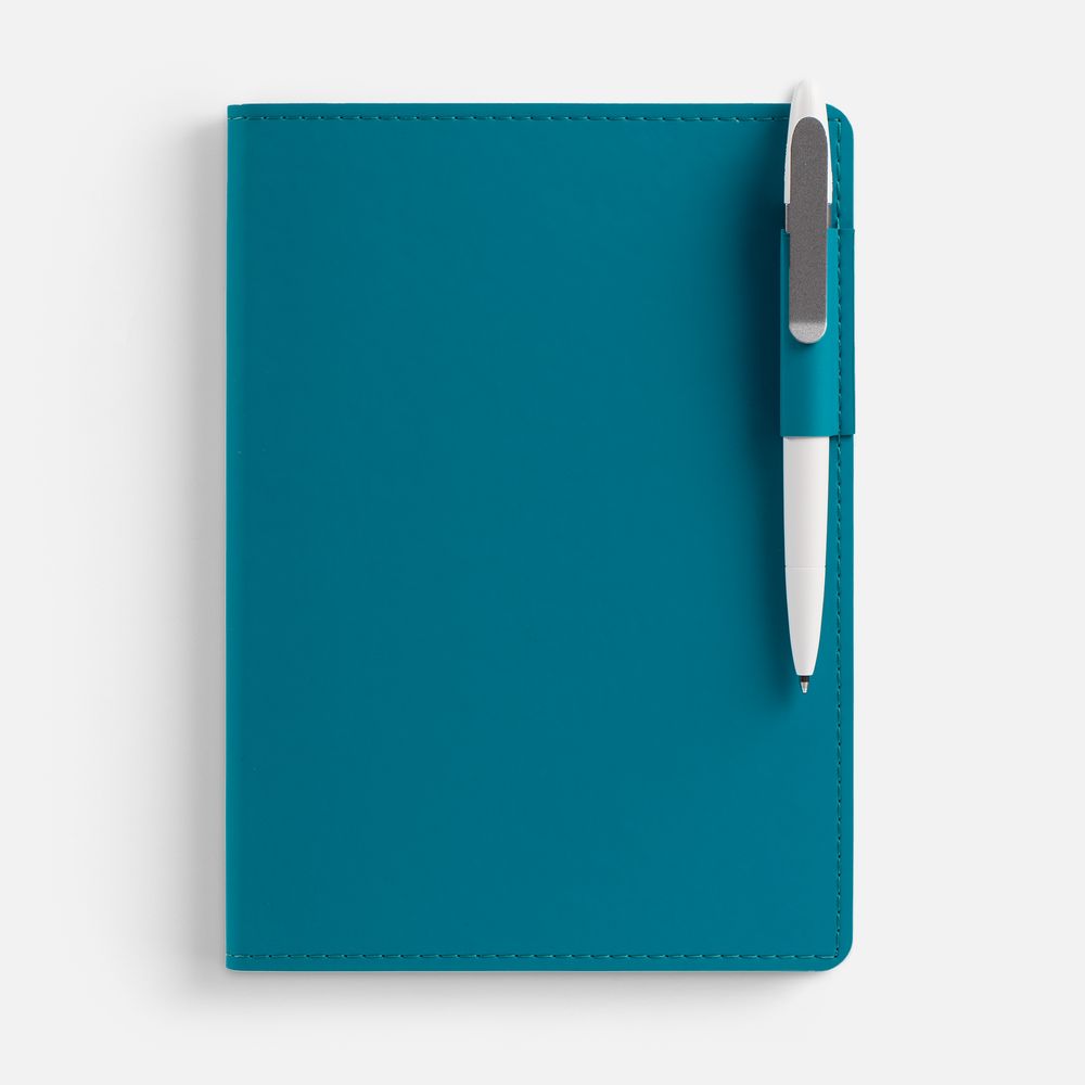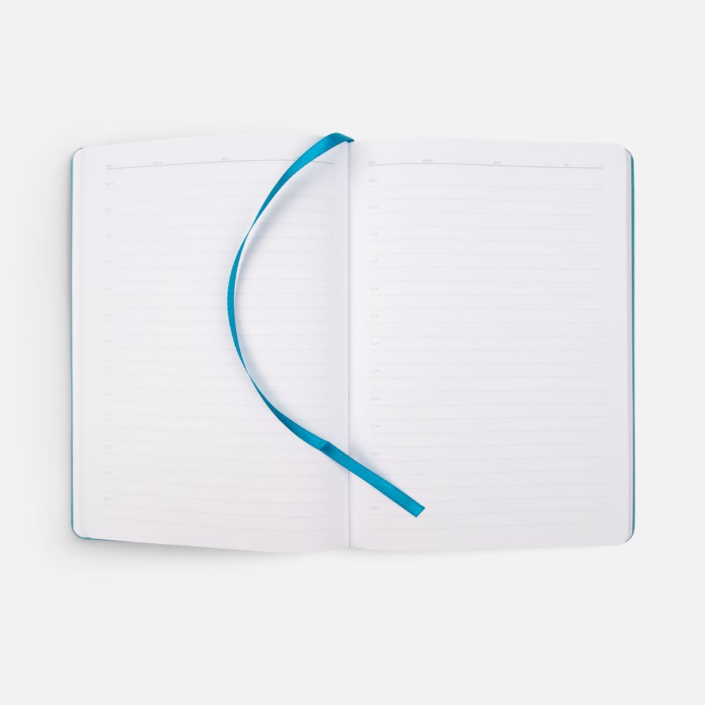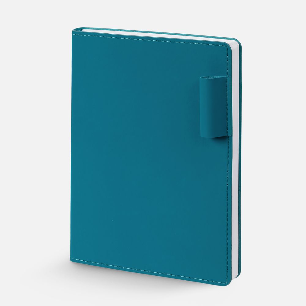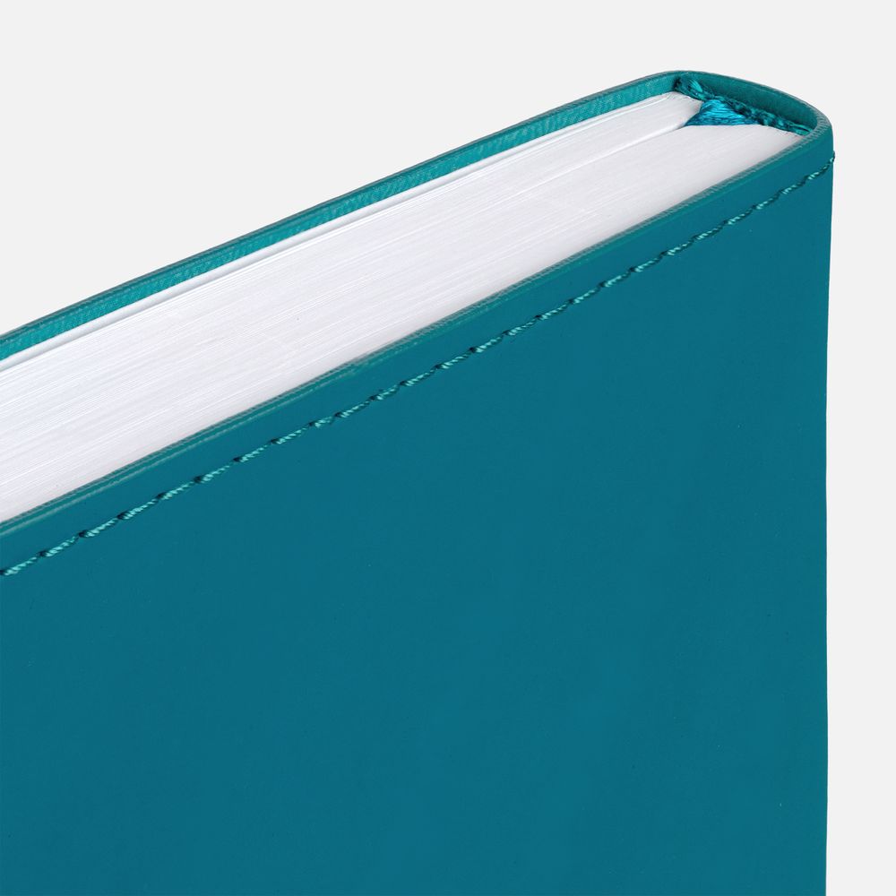 Ежедневник с гибкой обложкой из материала Soft Touch, цвет морской волны II и Latte, морская волна (внутренний материал), дополнен петелькой для ручки из покровного материала, капталом, ляссе и закрашенным срезом обложки в цвет материала.