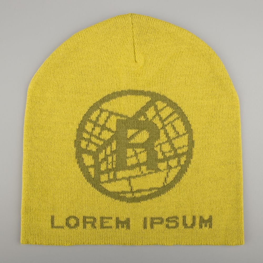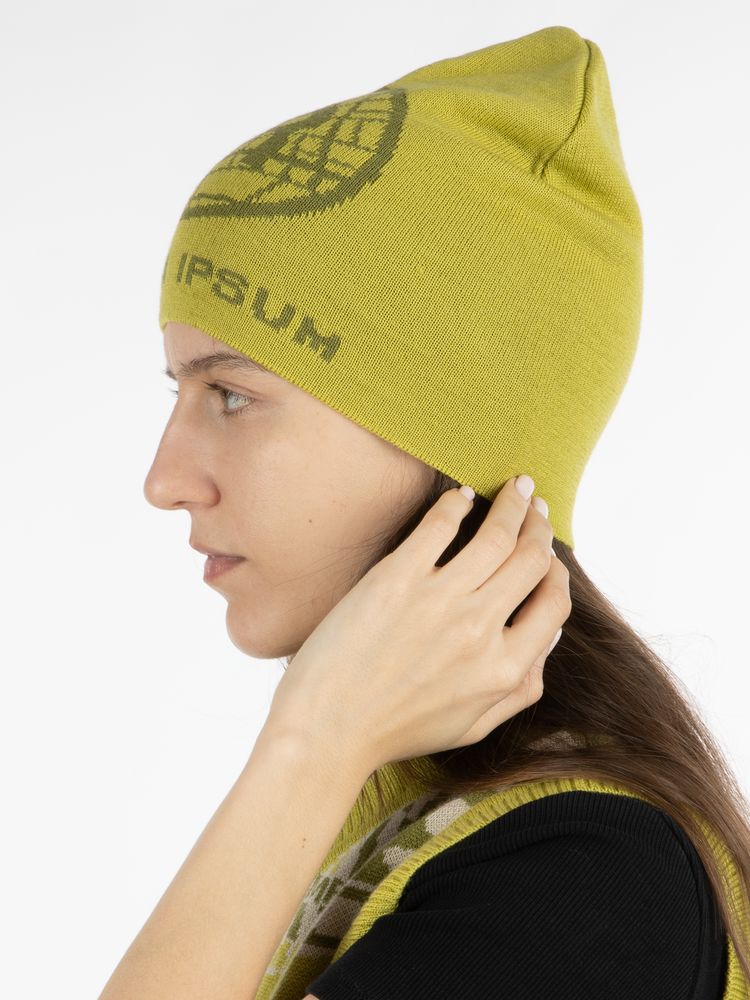 Шапка с вывязанным логотипом и индивидуальным рисунком в фирменной цветовой гамме.