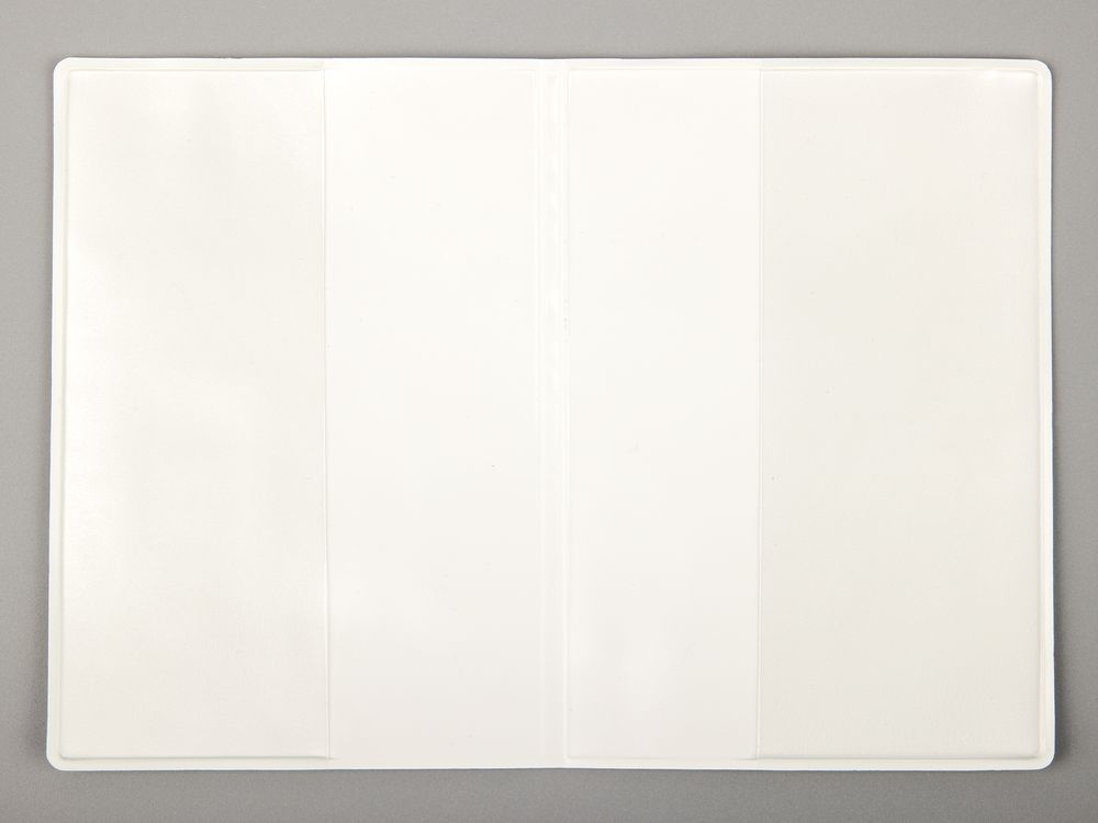Снаружи обложка выполнена из гладкого материала, внутри — кармашки из прозрачного ПВХ.