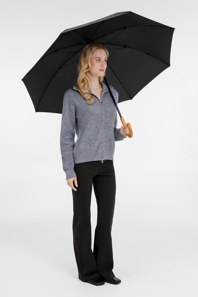 Элегантный зонт с большим куполом и деревянной J-образной ручкой.
