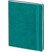 Ежедневник с гибкой обложкой выполнен из материала Latte, голубой JJ, и дополнен резинкой шириной 1 см, капталом и ляссе голубого цвета.