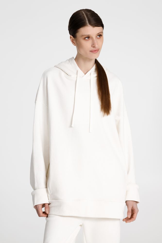 Худи унисекс свободной посадки со спущенным плечом.