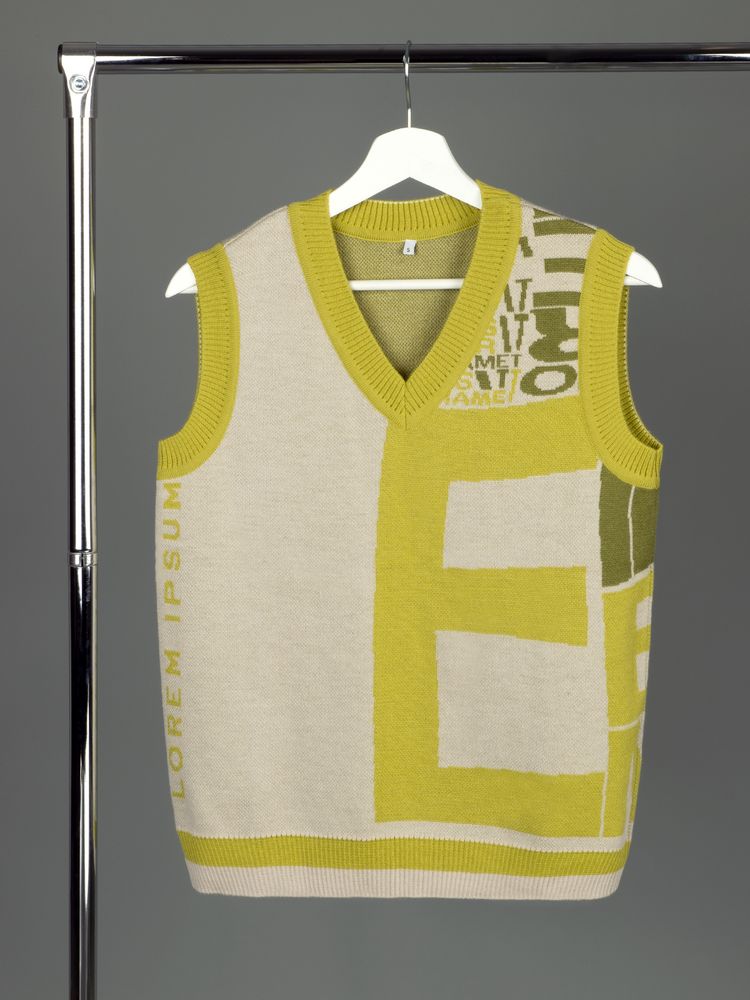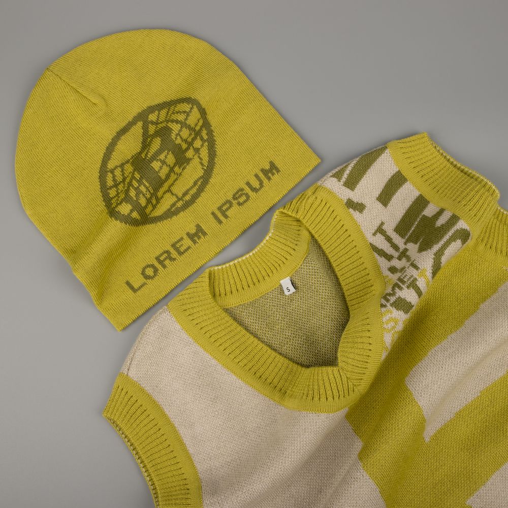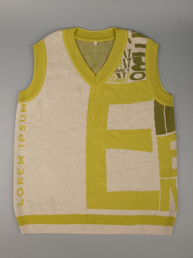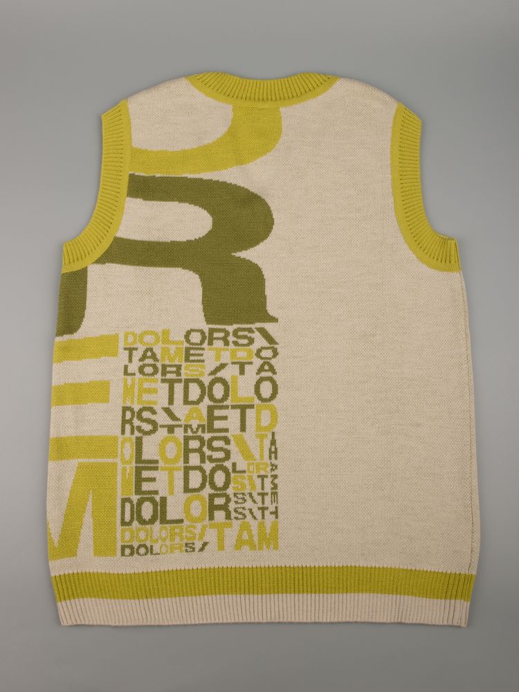 Жилет с вывязанным логотипом и индивидуальным рисунком в фирменной цветовой гамме.