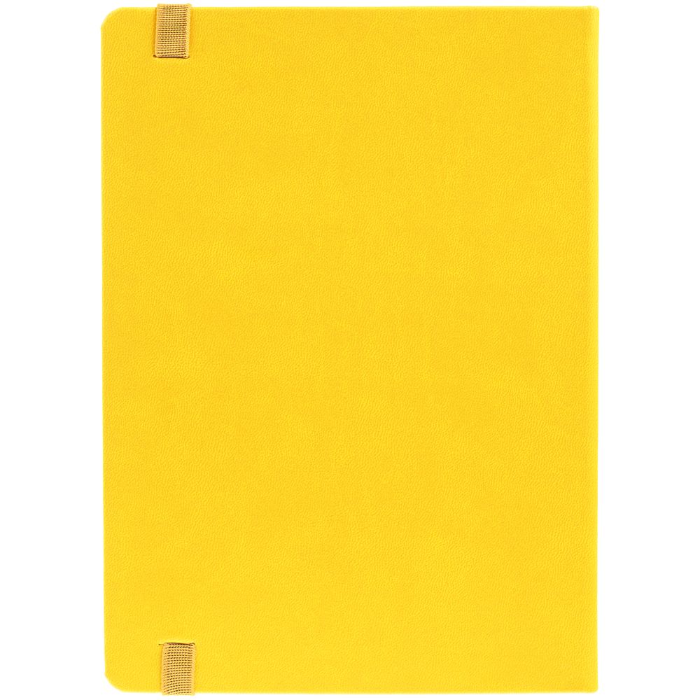 Ежедневник с твердой обложкой, выполнен из материала Latte, желтый КК, обрез зеленого цвета, дополнен ляссе желтого цвета и резинкой с металлическим шильдом.