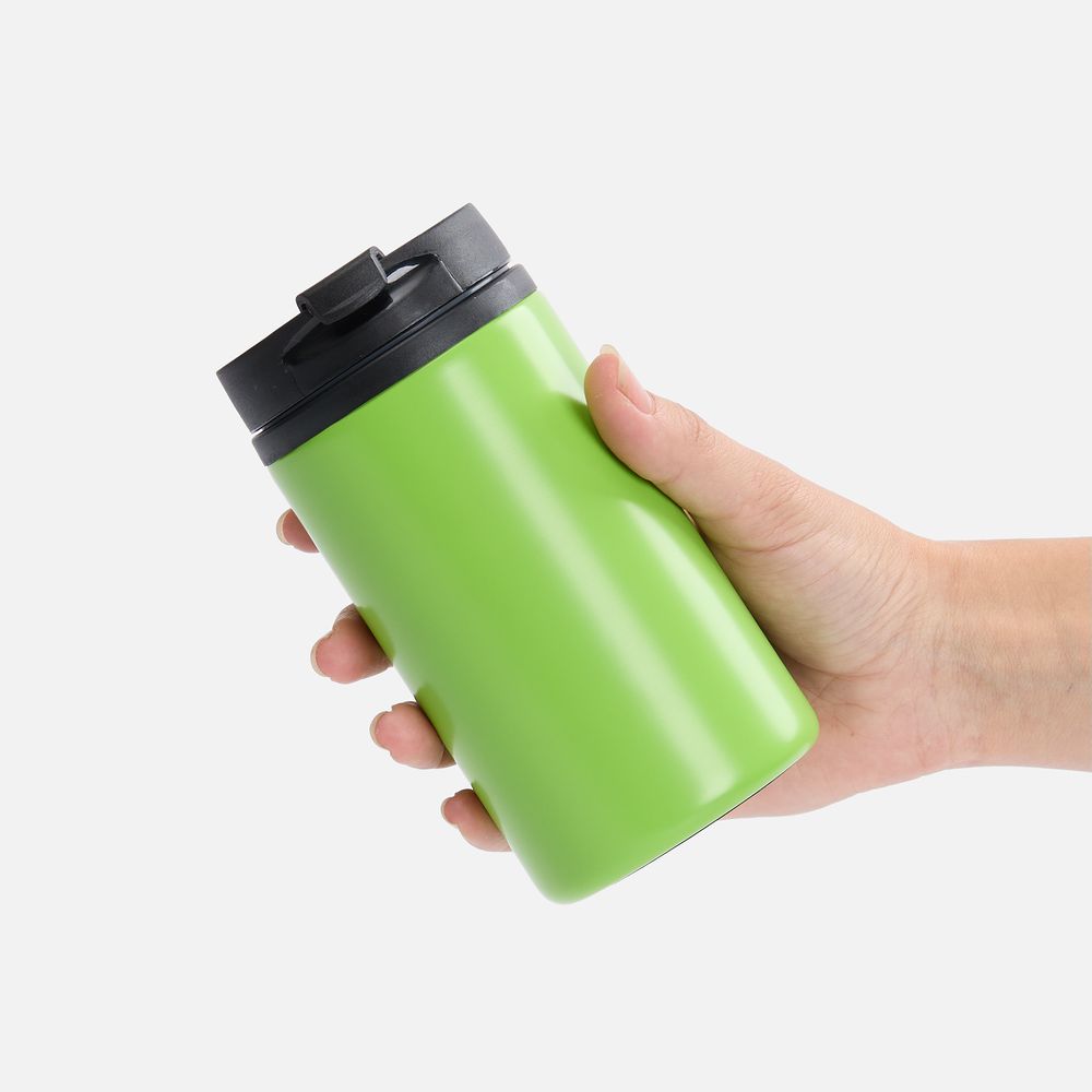Двухслойная конструкция из пищевого пластика внутри и нержавеющей стали снаружи. Герметичная завинчивающаяся крышка с откидным клапаном для питья.