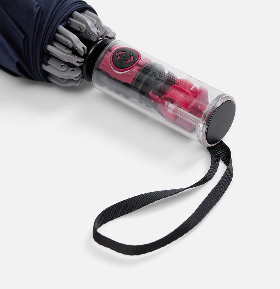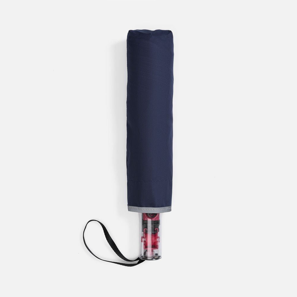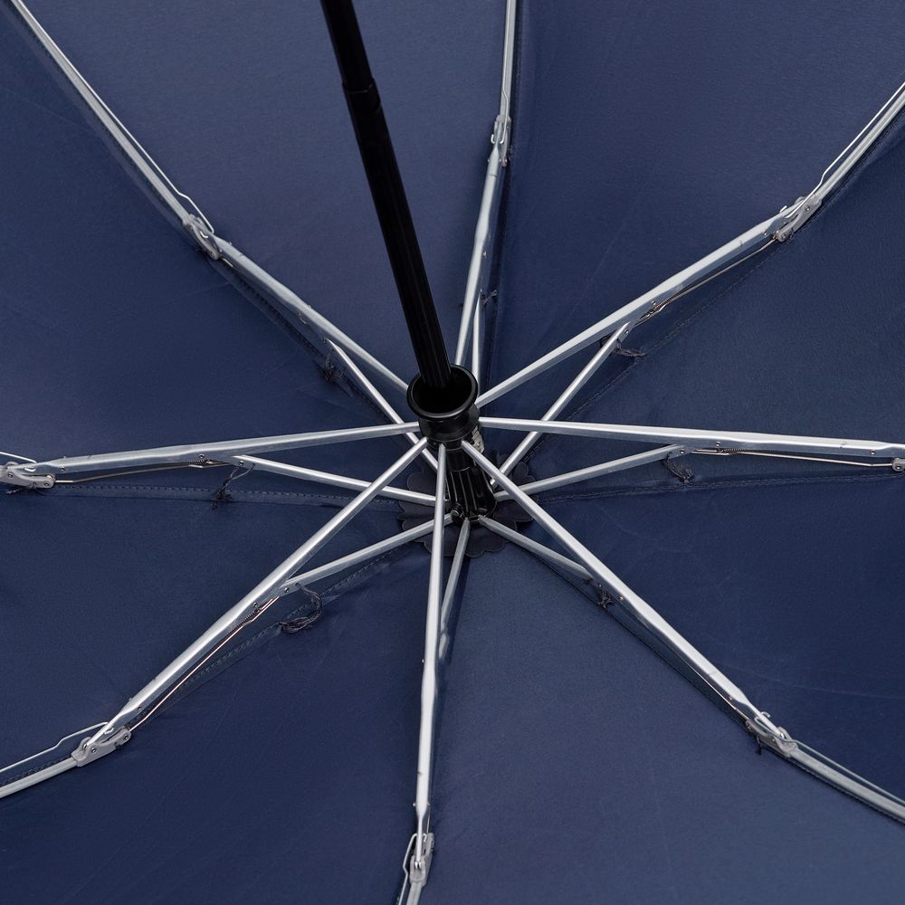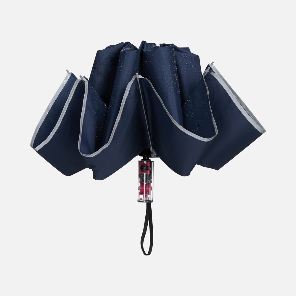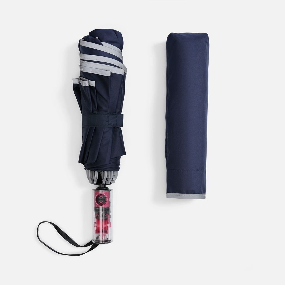 Складной зонт Futurum привлекает внимание оригинальным дизайном. Складываясь после дождя, он прячет мокрую поверхность в себя, а сухая остается снаружи. Светоотражающий кант и ручка из прозрачного пластика, не скрывающая ярких деталей внутри, добавляют внешнему виду зонта футуристичности.