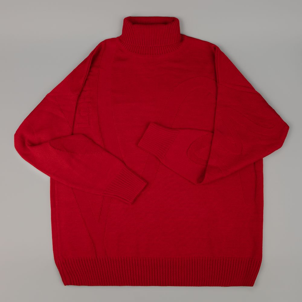 Однотонный свитер с фактурным вывязанным логотипом в фирменном цвете вашей компании.