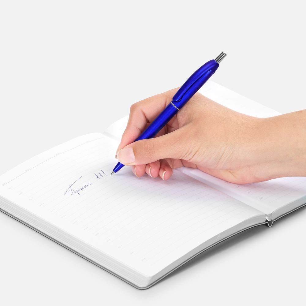 Шариковая пластиковая ручка в корпусе с эффектом «металлик» и серебристыми деталями. Приятная округлая форма клипа добавляет ручке плавности и объема.