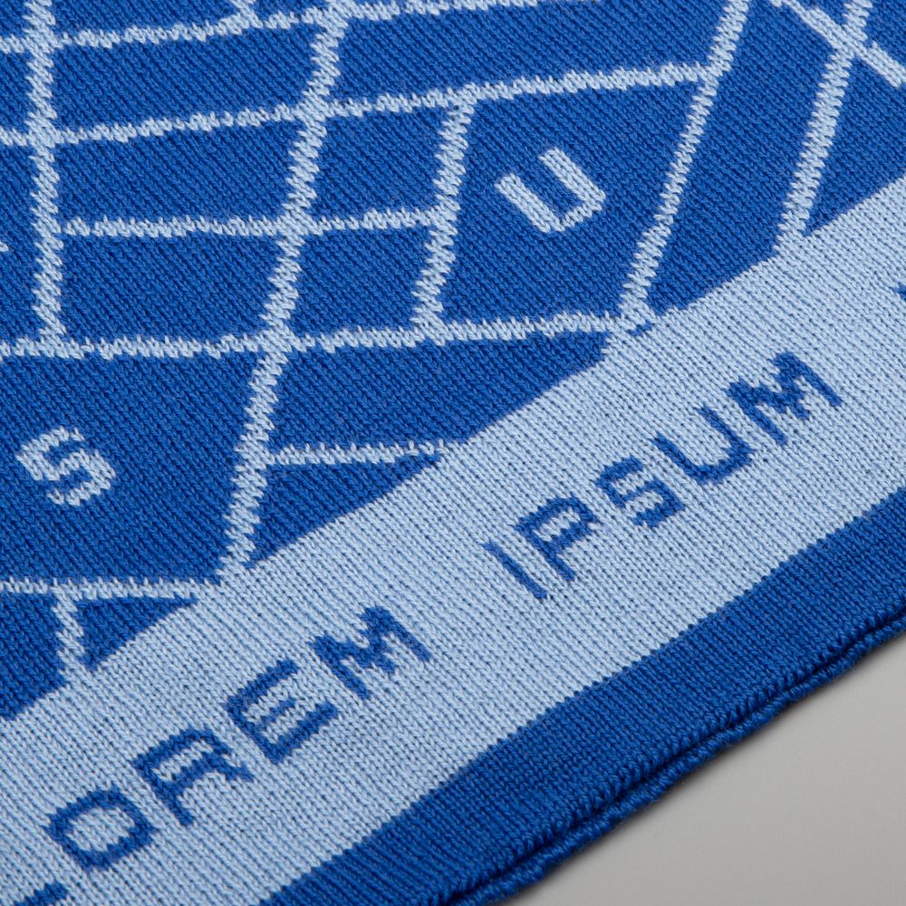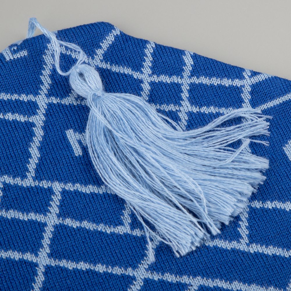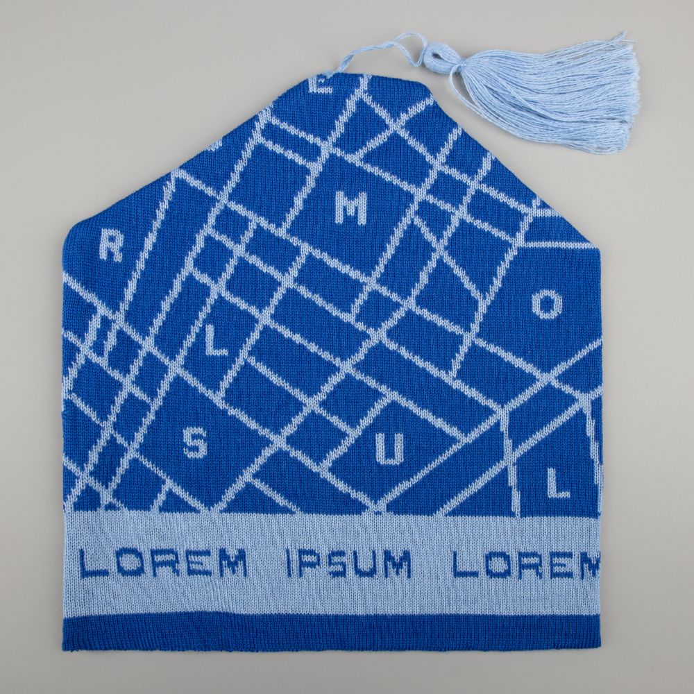 Шапка-петушок с вывязанным логотипом и индивидуальным рисунком в фирменной цветовой гамме.