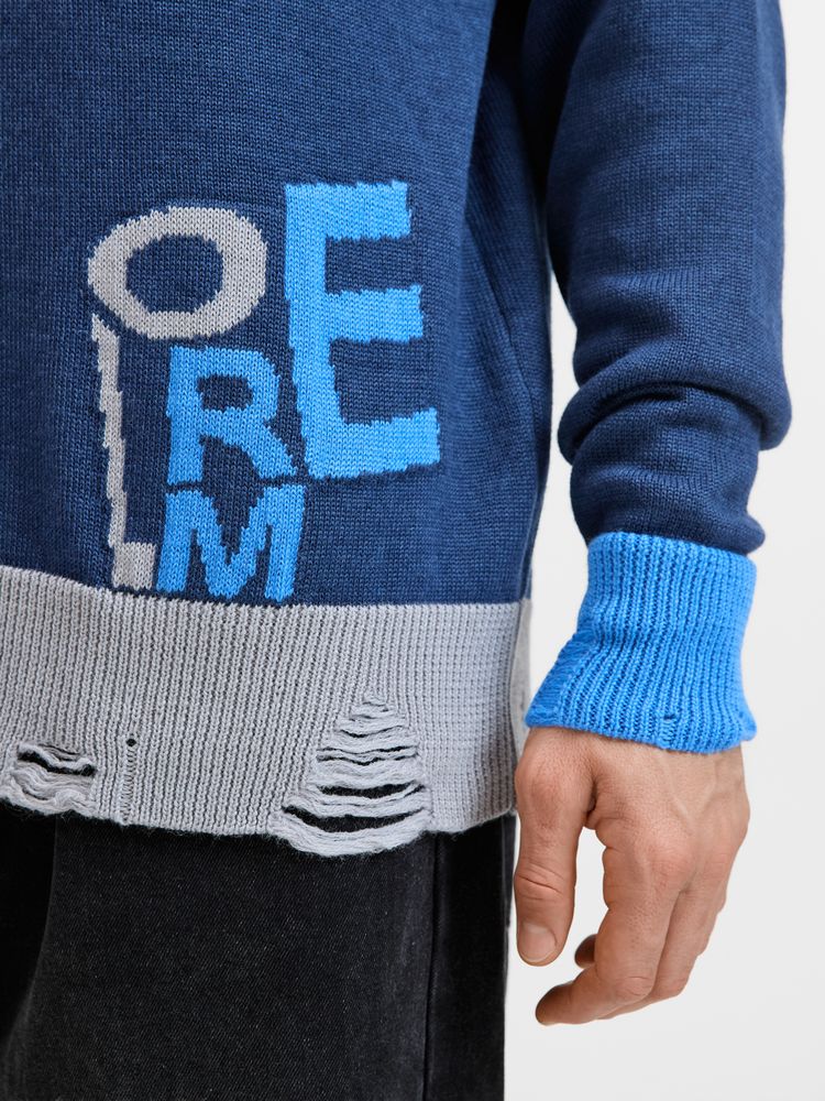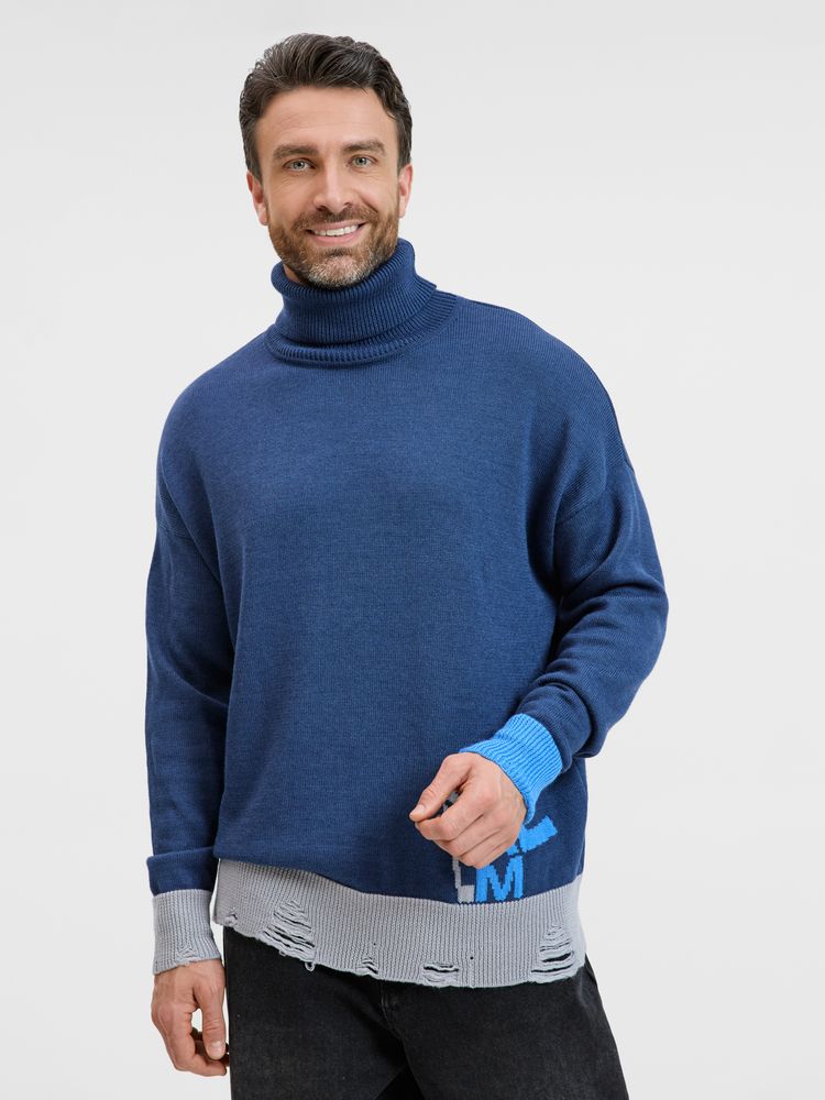 Свитер унисекс с вывязанным логотипом и индивидуальным рисунком в фирменной цветовой гамме.