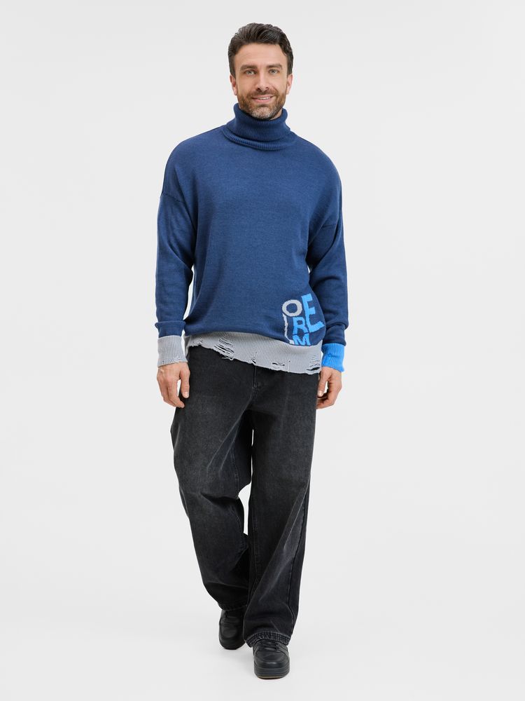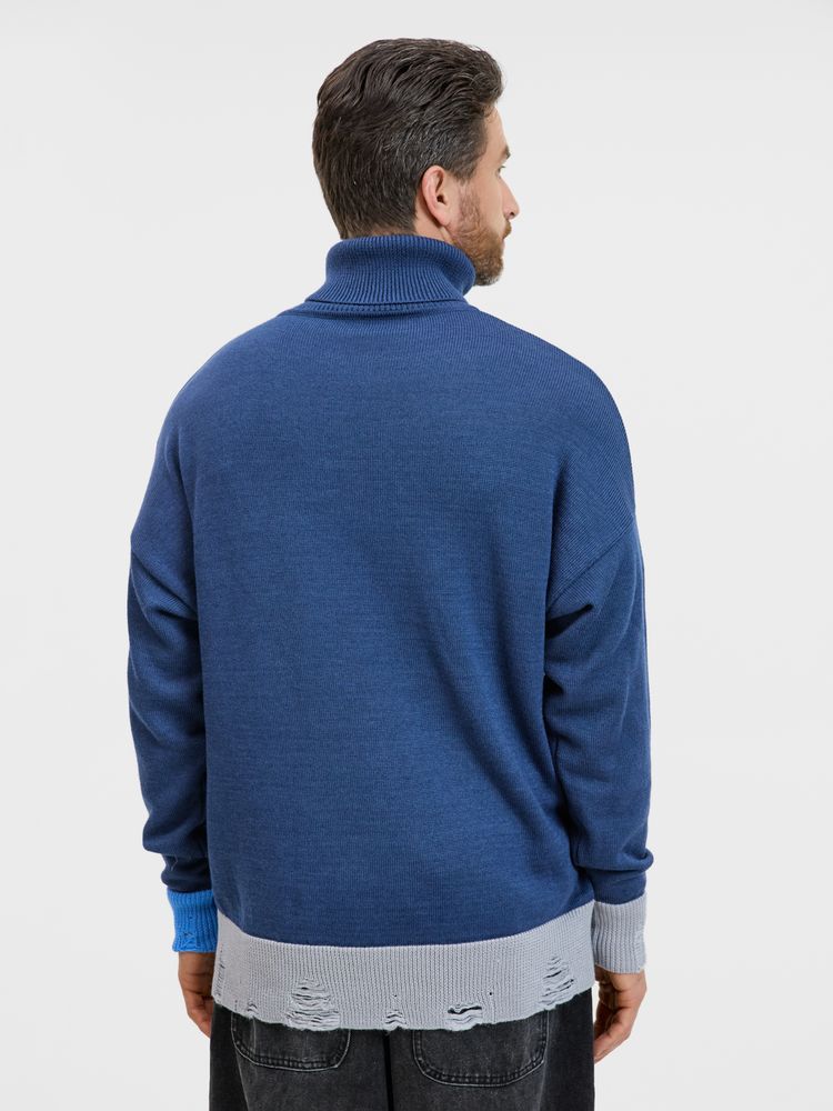 Модель: однотонный гладкий свитер унисекс, спущенное плечо. Ворот, манжеты и низ изделия вывязаны резинкой c добавлением эффекта «рваного» края.