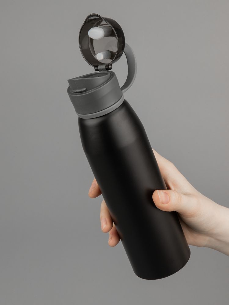 Легкая бутылка для спорта с откидной крышкой и силиконовой петлей для удобной транспортировки.Емкость 650 мл.Поставляется в индивидуальном пакете.
