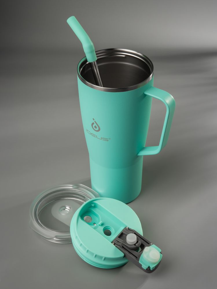 • 2 крышки в комплекте: одна на 100% герметичная с механизмом блокировки отверстия для питья, вторая — с отверстием для трубочки