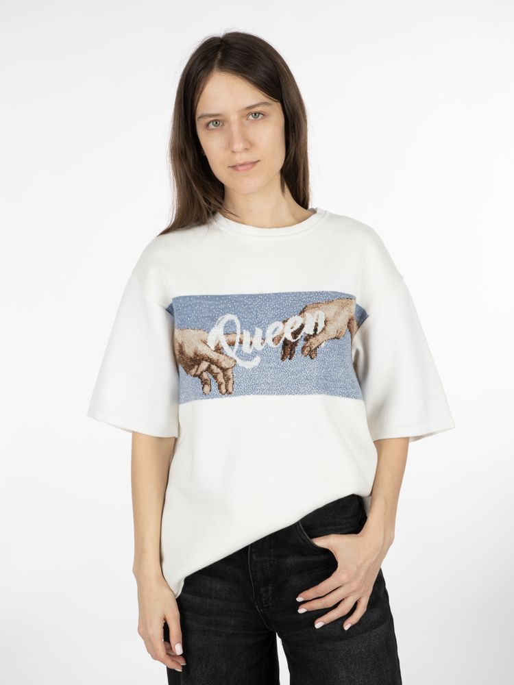 Лонгслив унисекс с вывязанным логотипом и индивидуальным рисунком в фирменной цветовой гамме.