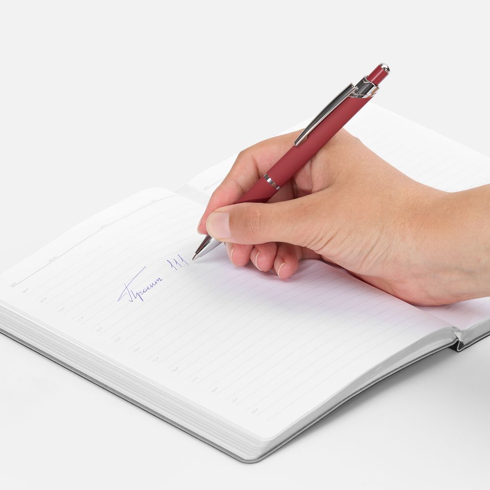 Металлическая ручка с покрытием софт-тач и серебристыми деталями.