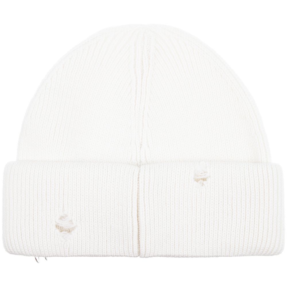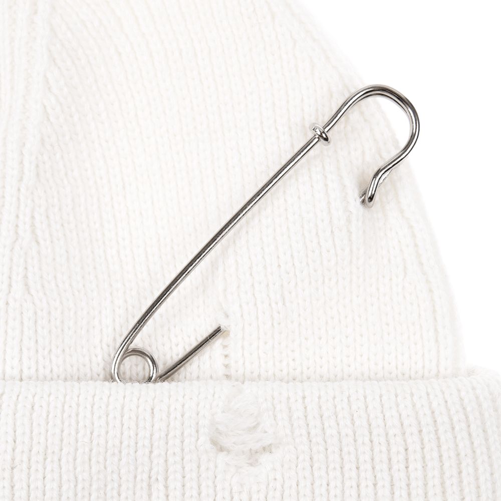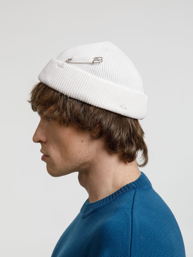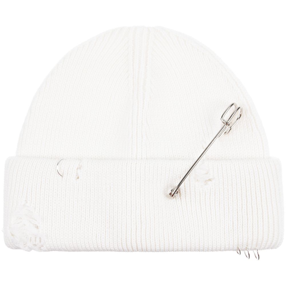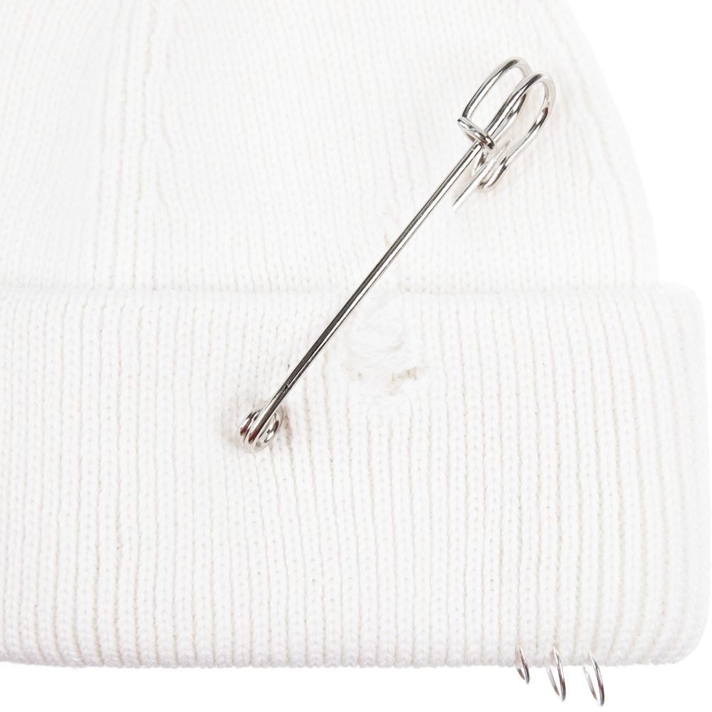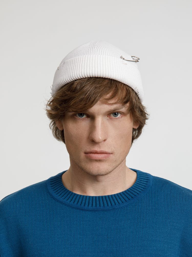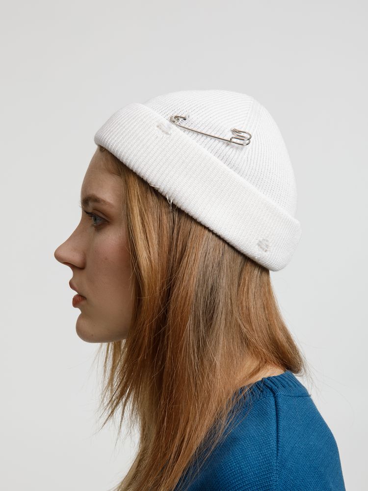 Однослойная шапка бини с рваным отворотом и металлическими аксессуарами для дерзких образов в любом возрасте. Яркий и запоминающийся акцент в стиле гранж. Поставляется в пакете с липким краем.