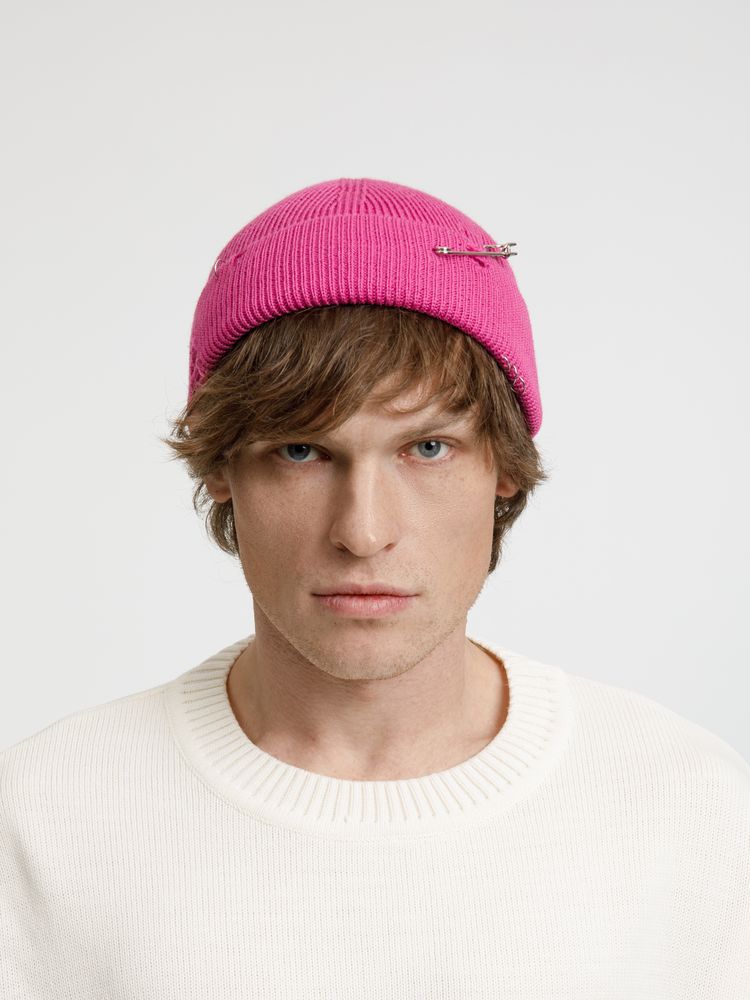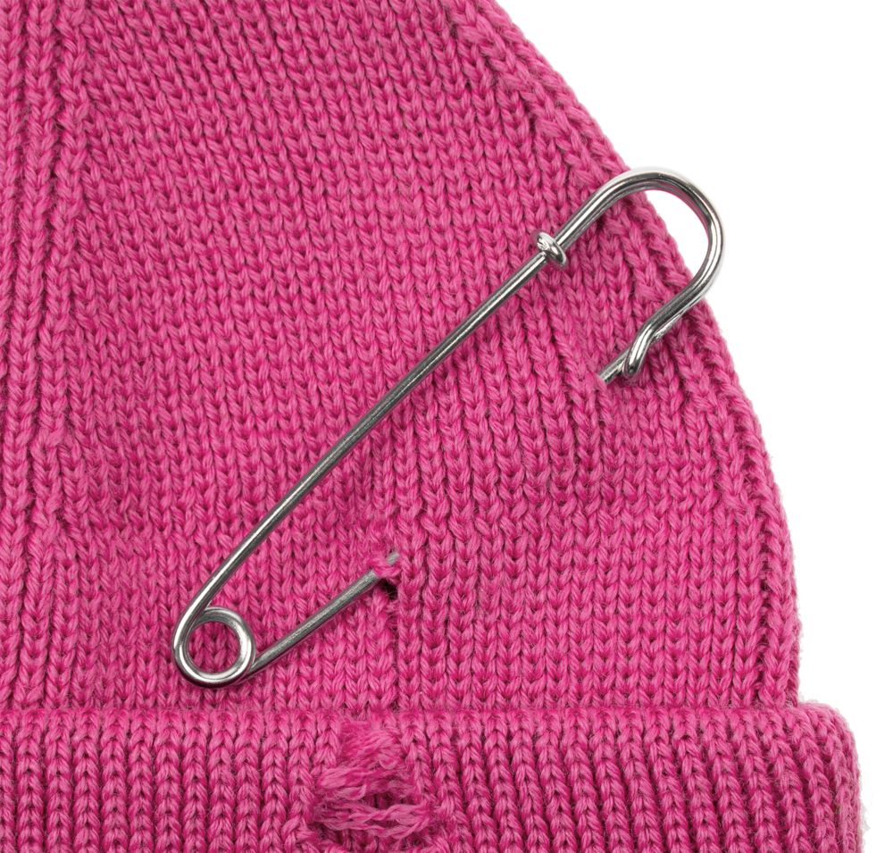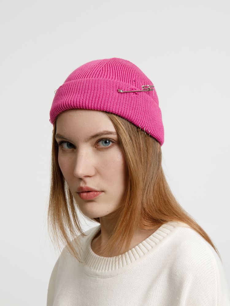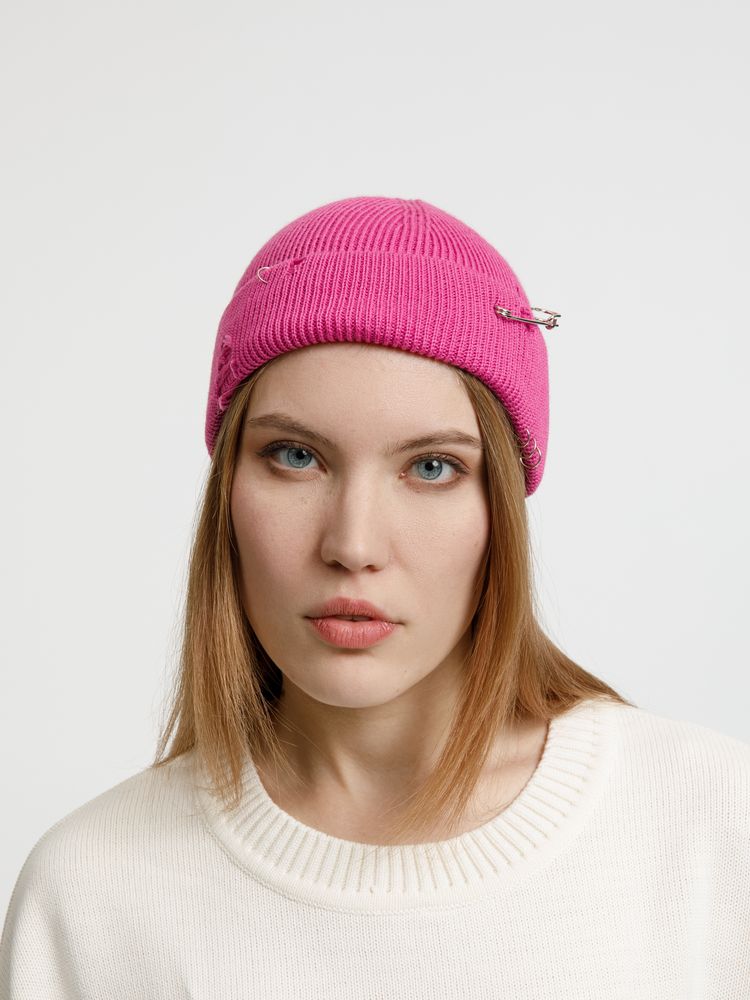Однослойная шапка бини с рваным отворотом и металлическими аксессуарами для дерзких образов в любом возрасте. Яркий и запоминающийся акцент в стиле гранж. Поставляется в пакете с липким краем.