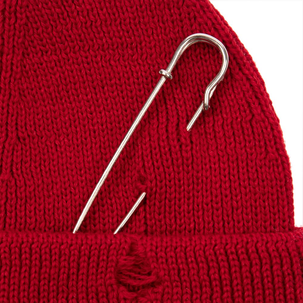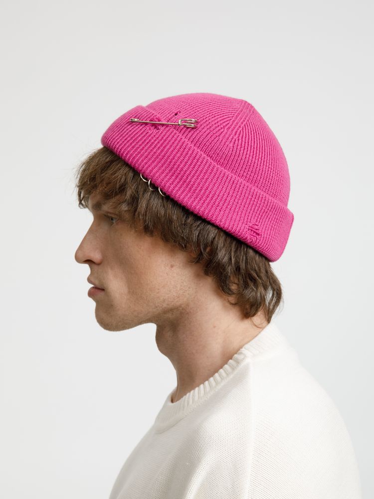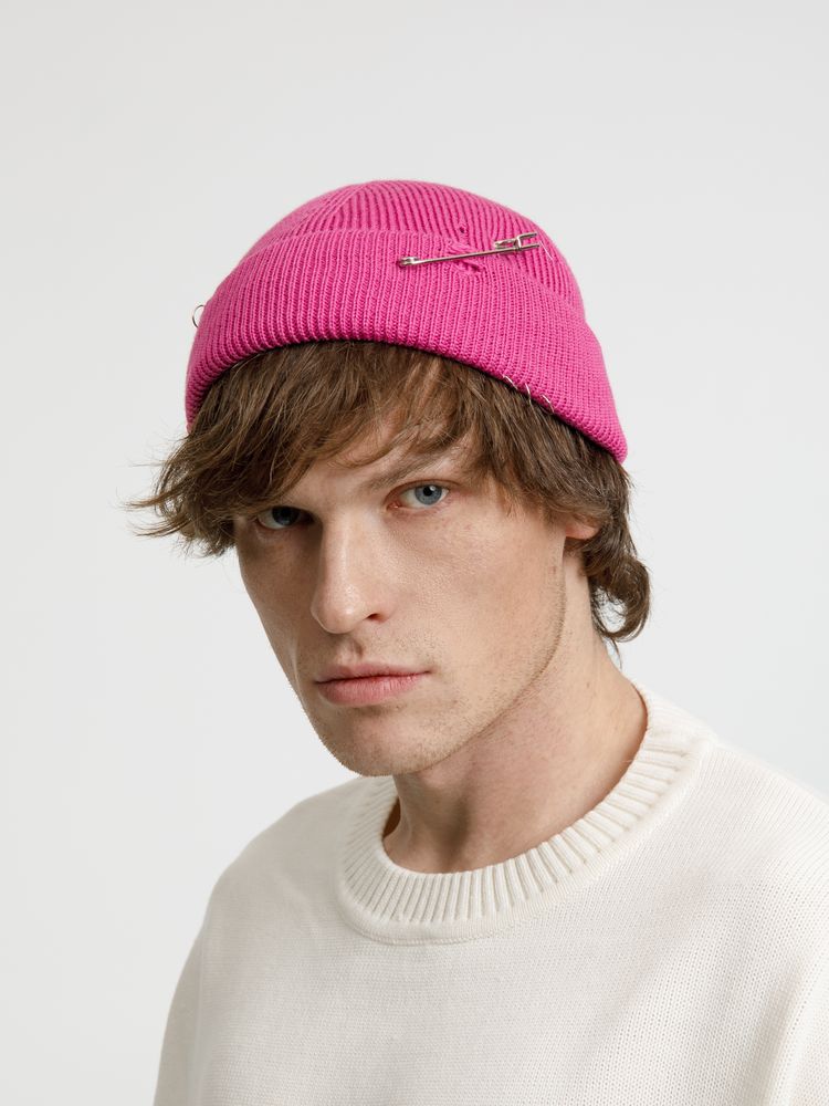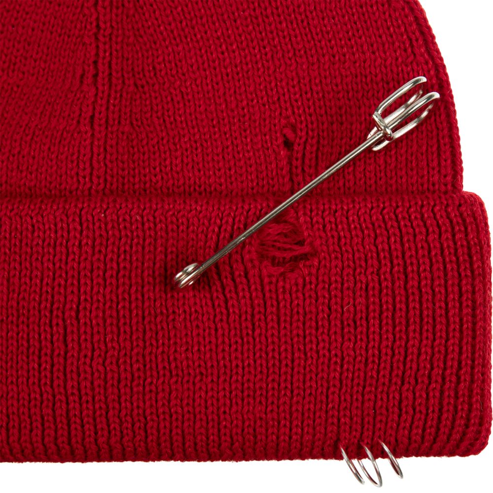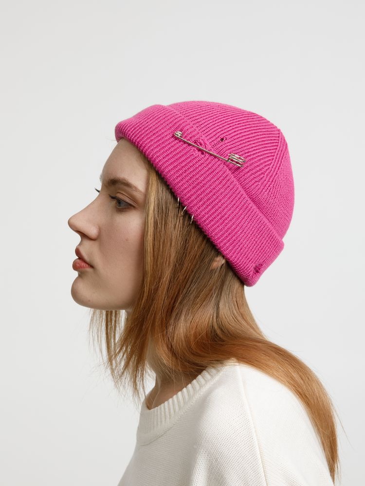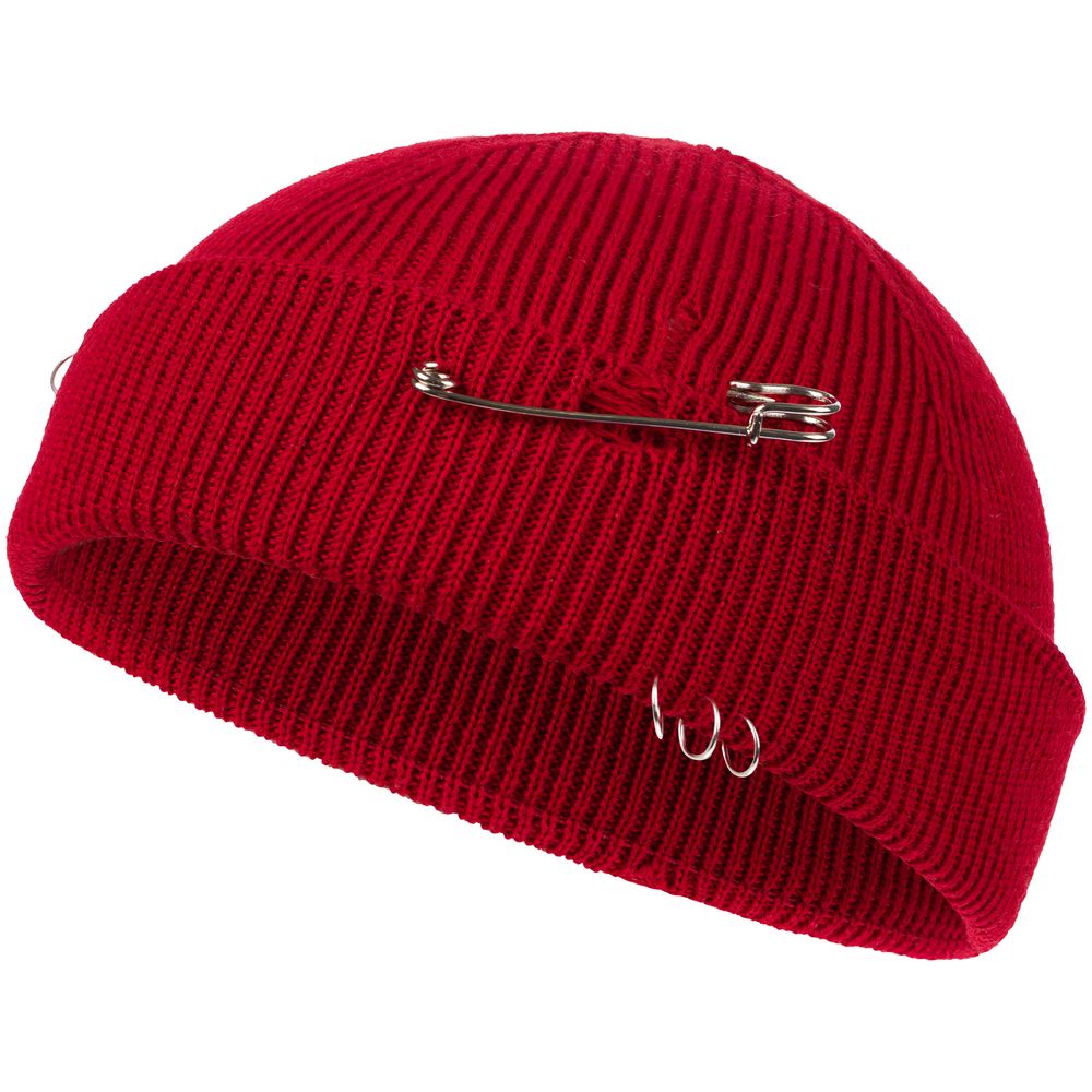 Однослойная шапка бини с рваным отворотом и металлическими аксессуарами для дерзких образов в любом возрасте. Яркий и запоминающийся акцент в стиле гранж. Поставляется в пакете с липким краем.
