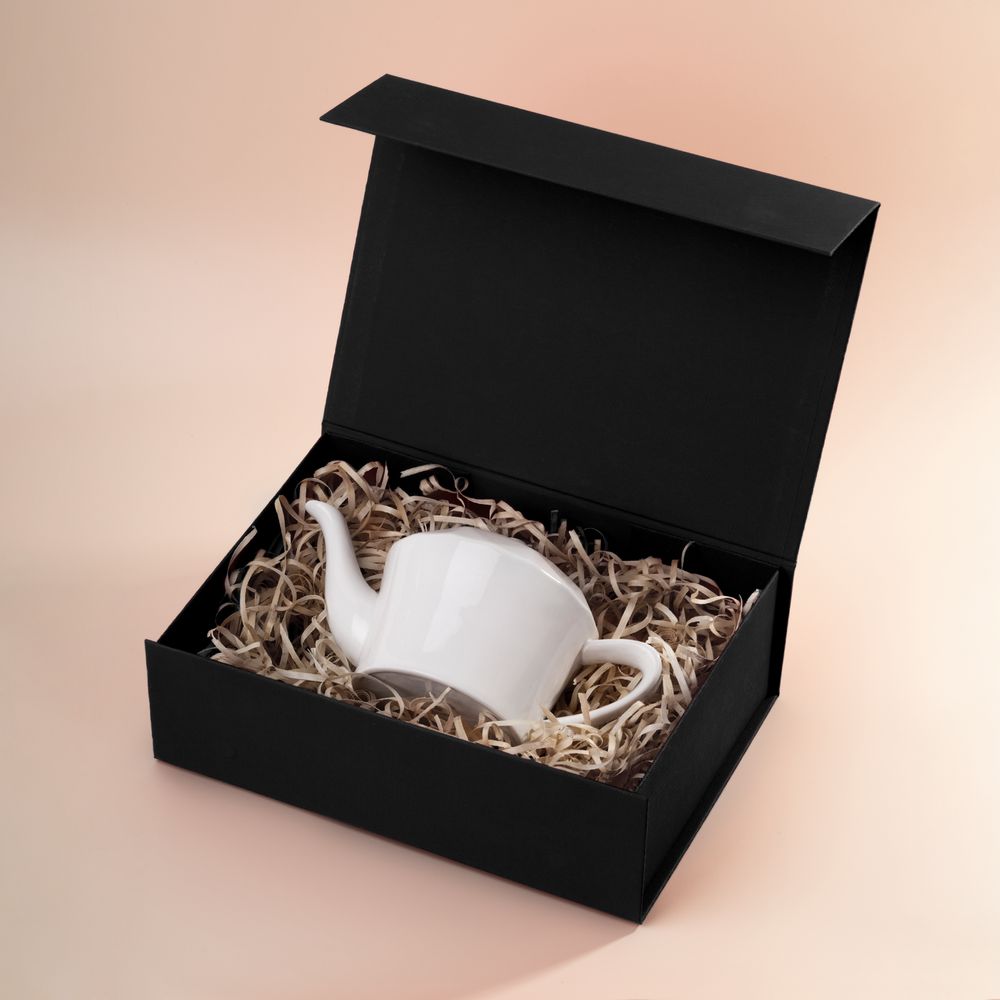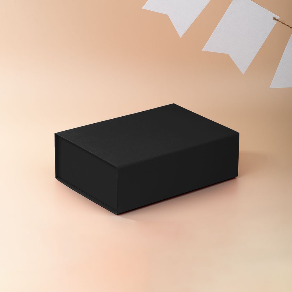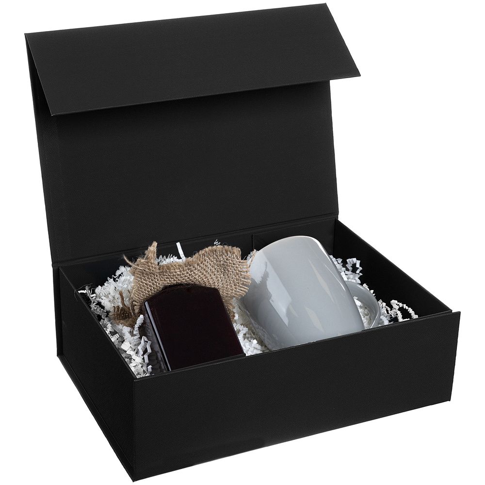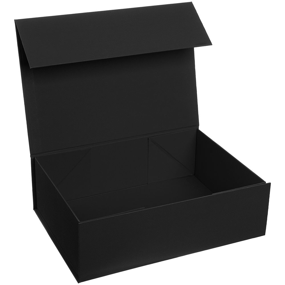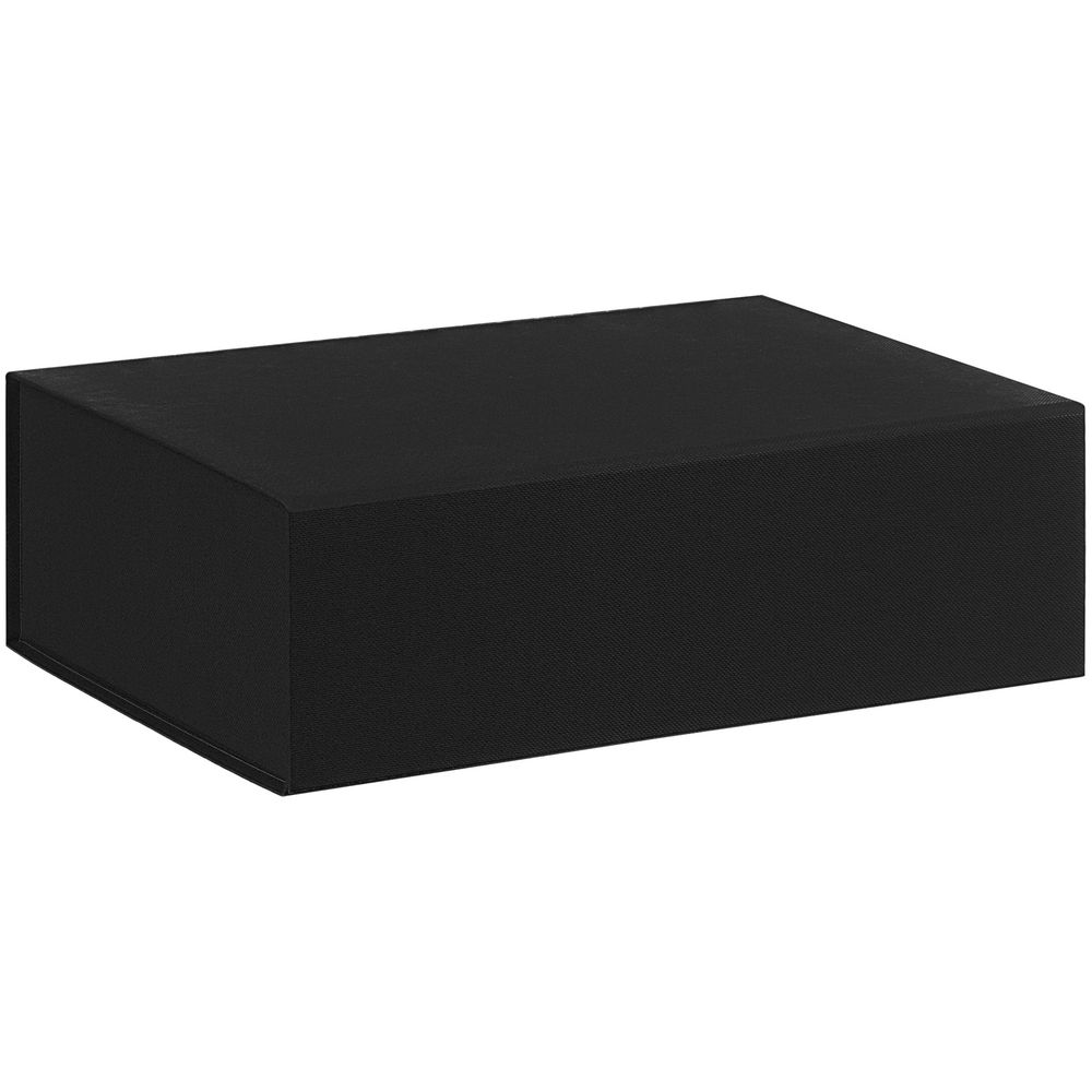 Коробка из переплетного картона, кашированного тисненой тонированной в массе бумагой, с крышкой на магните. Толщина картона 2 мм. Поставляется в плоском виде. Сборка осуществляется на скотч.