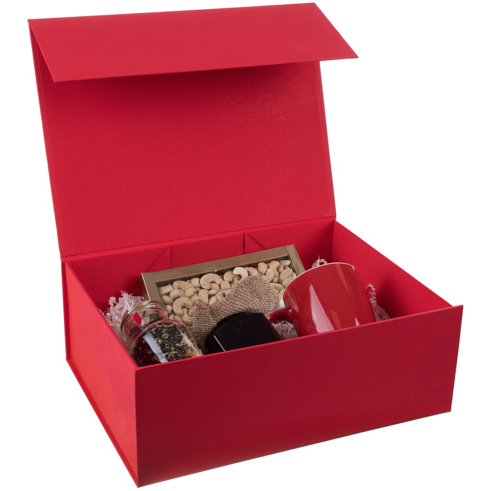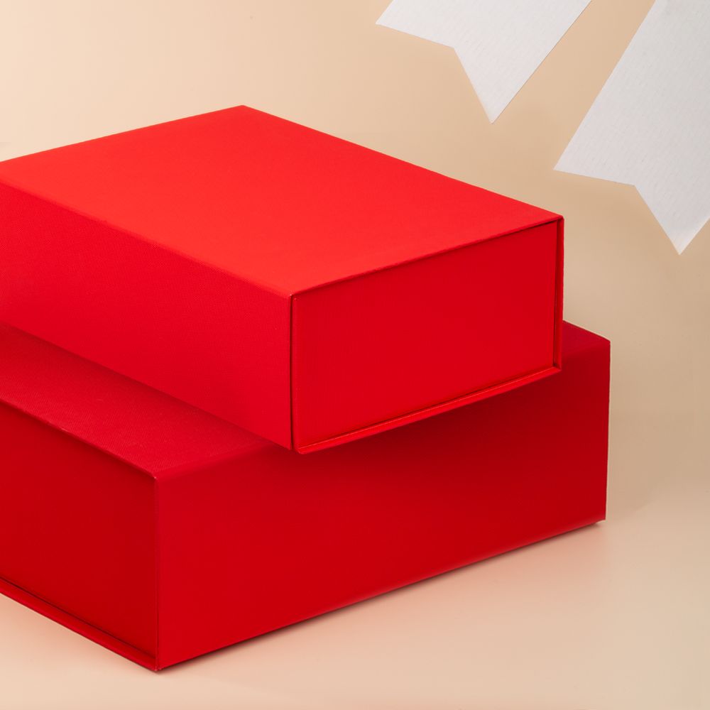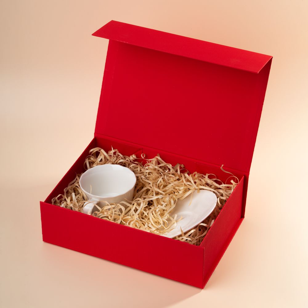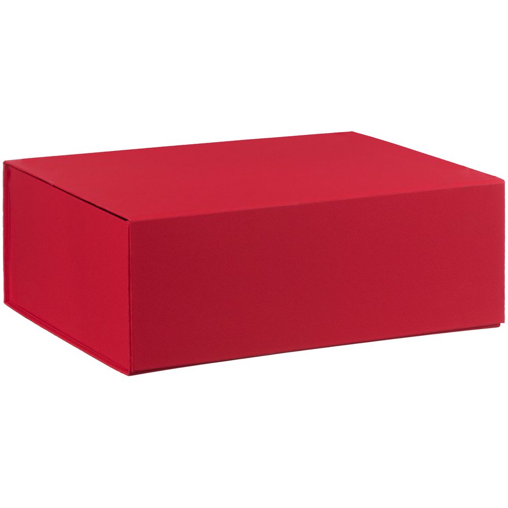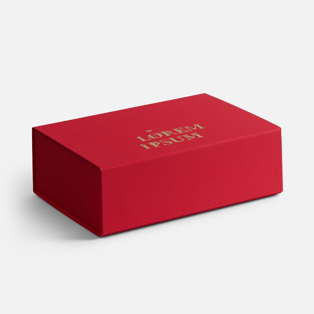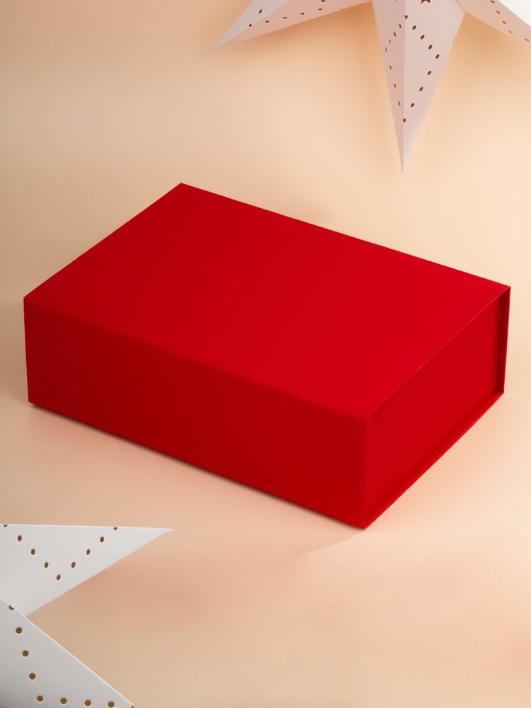 Коробка из переплетного картона, кашированного тисненой тонированной в массе бумагой, с крышкой на магните. Толщина картона 2 мм. Поставляется в плоском виде. Сборка осуществляется на скотч.