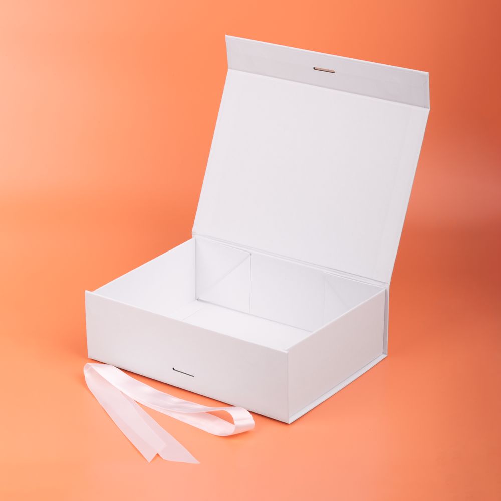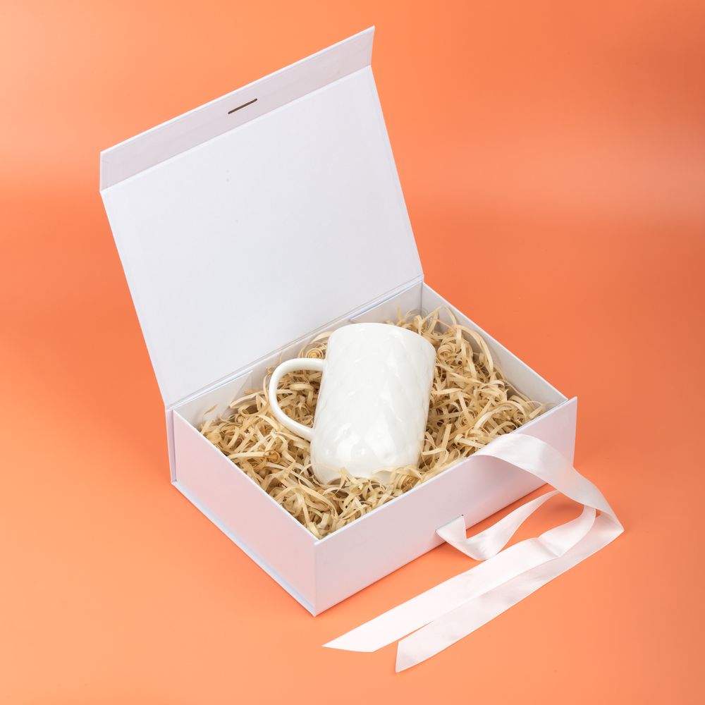 Коробка из переплетного картона, кашированного тонированной в массе крафтовой бумагой. Крышка на двух магнитах дополнительно фиксируется репсовой лентой.Толщина картона 2 мм.