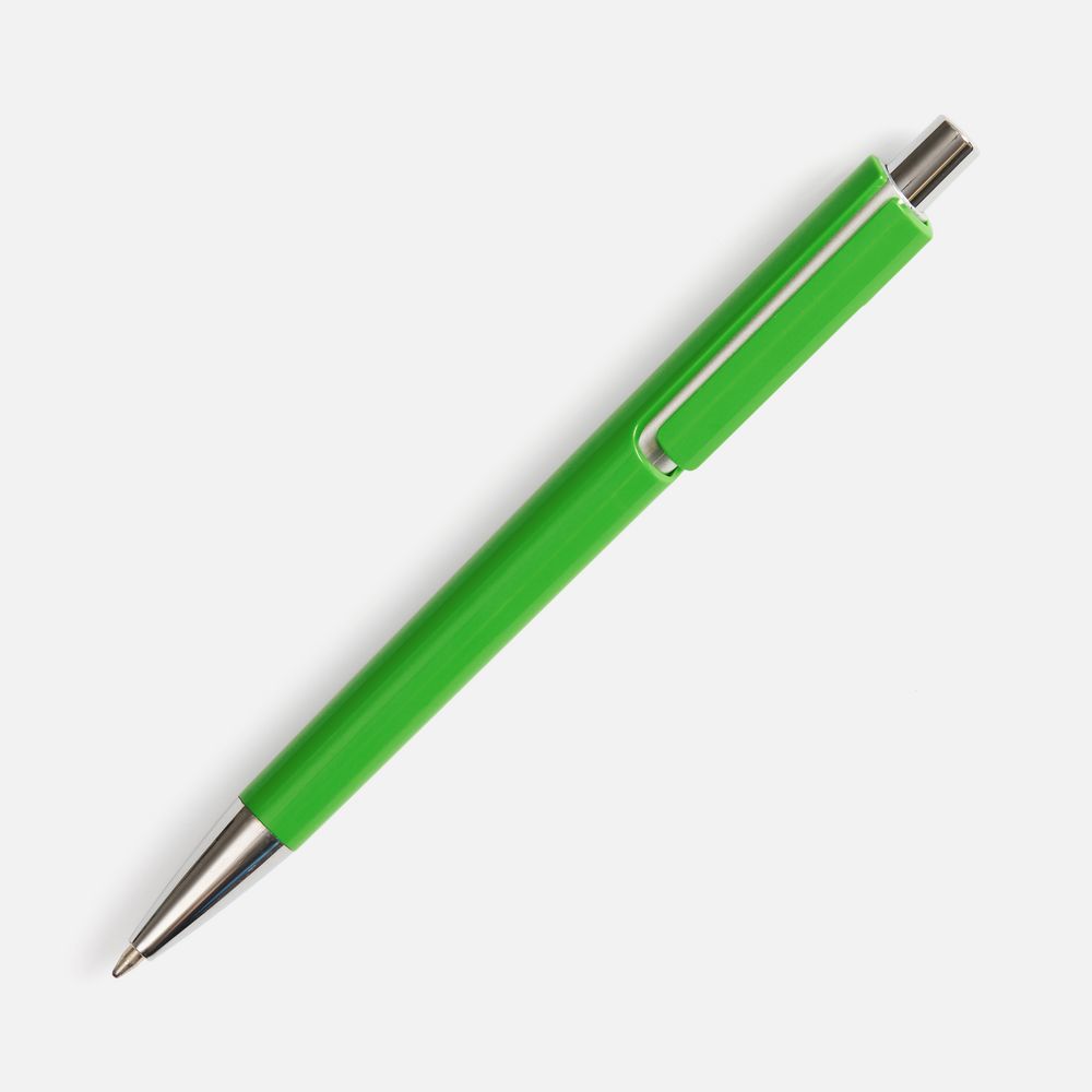 Шариковая ручка с цветным глянцевым корпусом и акцентными серебристыми деталями.
