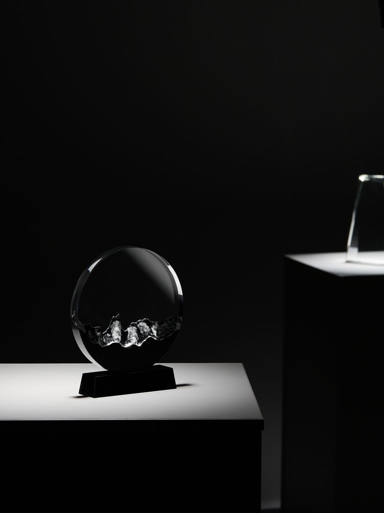 Прозрачная круглая часть и черное основание стелы изготовлены из премиального стекла К9, в основе которого лежит оптическое боросиликатное стекло. Эту марку стекла отличает низкий процент посторонних включений, высокий показатель преломления и высокая прозрачность — идеальные качества для изготовления наград премиального уровня.