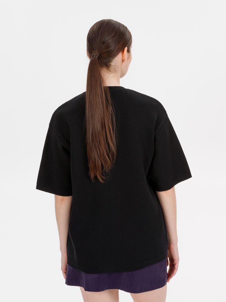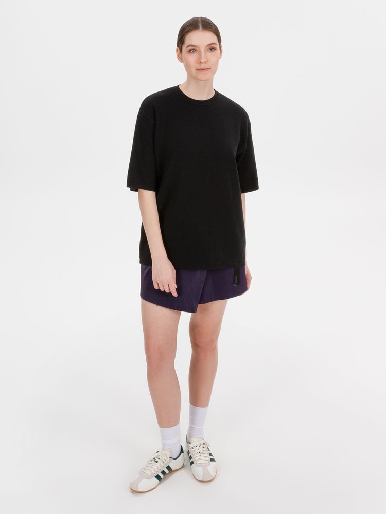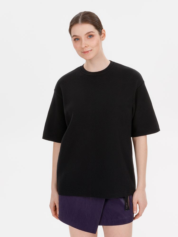Siluetti Volumica — плотный вязаный джемпер-футболка прямого кроя с круглым вырезом и спущенной линией плеча. Фирменная бирка из силиконовой ленты станет интересной деталью, привлекающей внимание на фоне общей лаконичности модели.