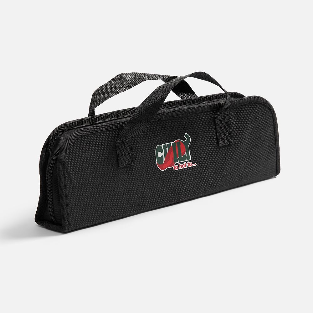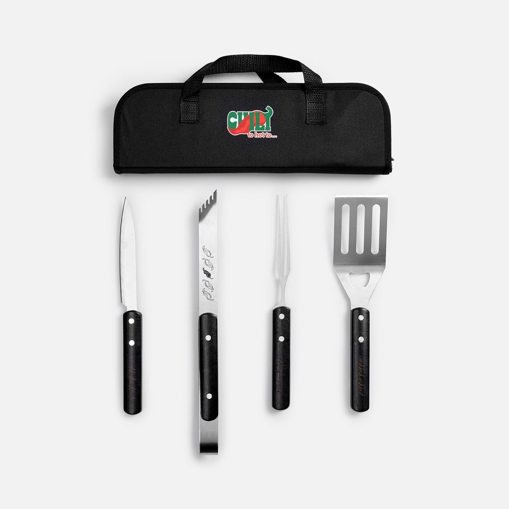• Размеры: вилка: 29х2,5х1,5 см; лопатка: 28,5х7х1,5 см; щипцы: 33х2,5х6 см; нож: 29х2,5х1,5 см; чехол: 36х11х5 см