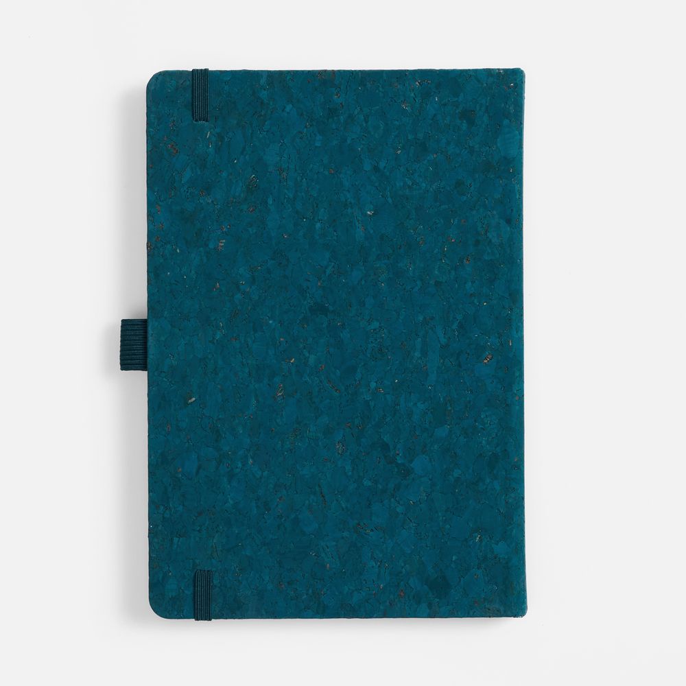 Блокнот с твердой обложкой из натуральной окрашенной пробки, дополнен петлей-резинкой для ручки, ляссе и резинкой в цвет обложки.