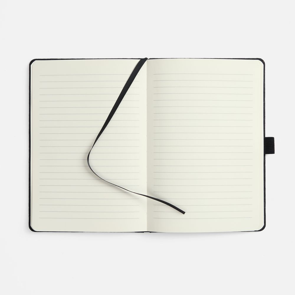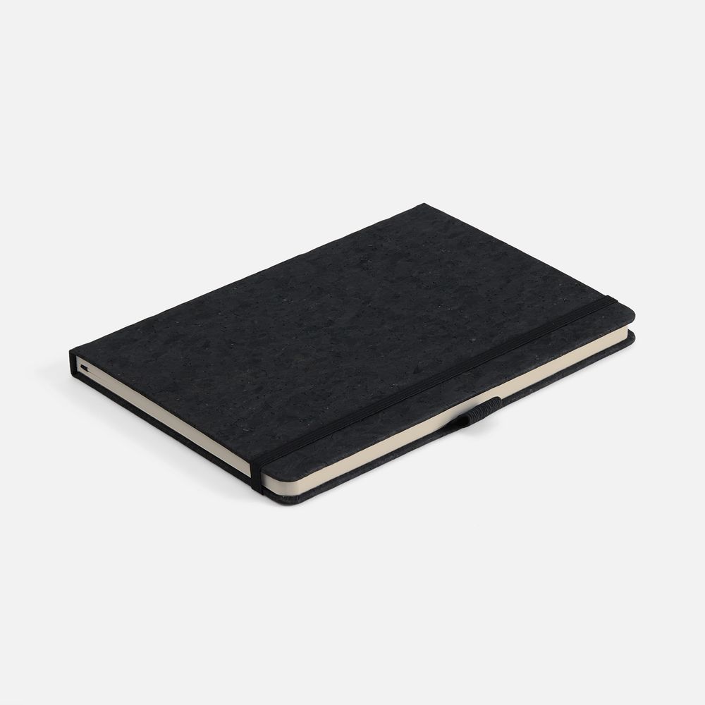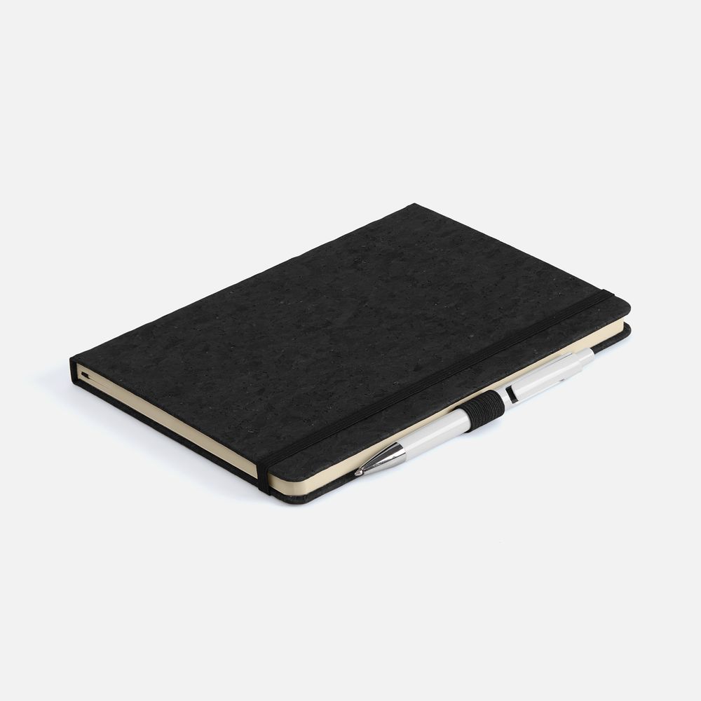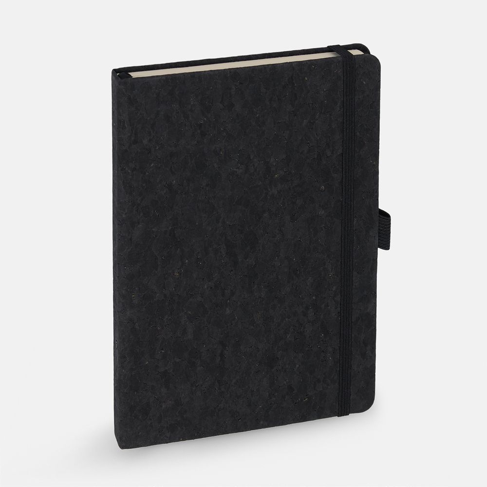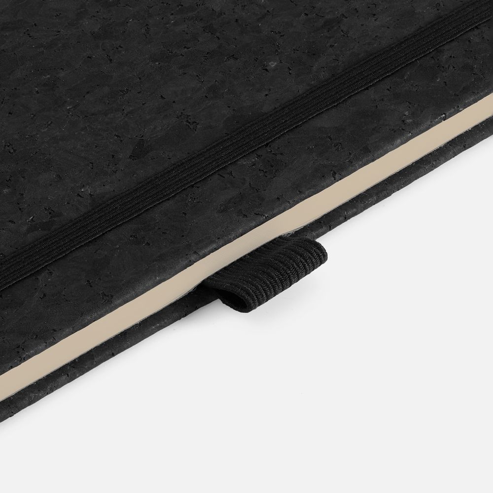 Блокнот с твердой обложкой из натуральной окрашенной пробки, дополнен петлей-резинкой для ручки, ляссе и резинкой в цвет обложки.