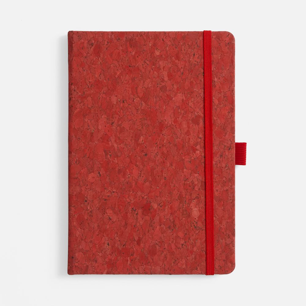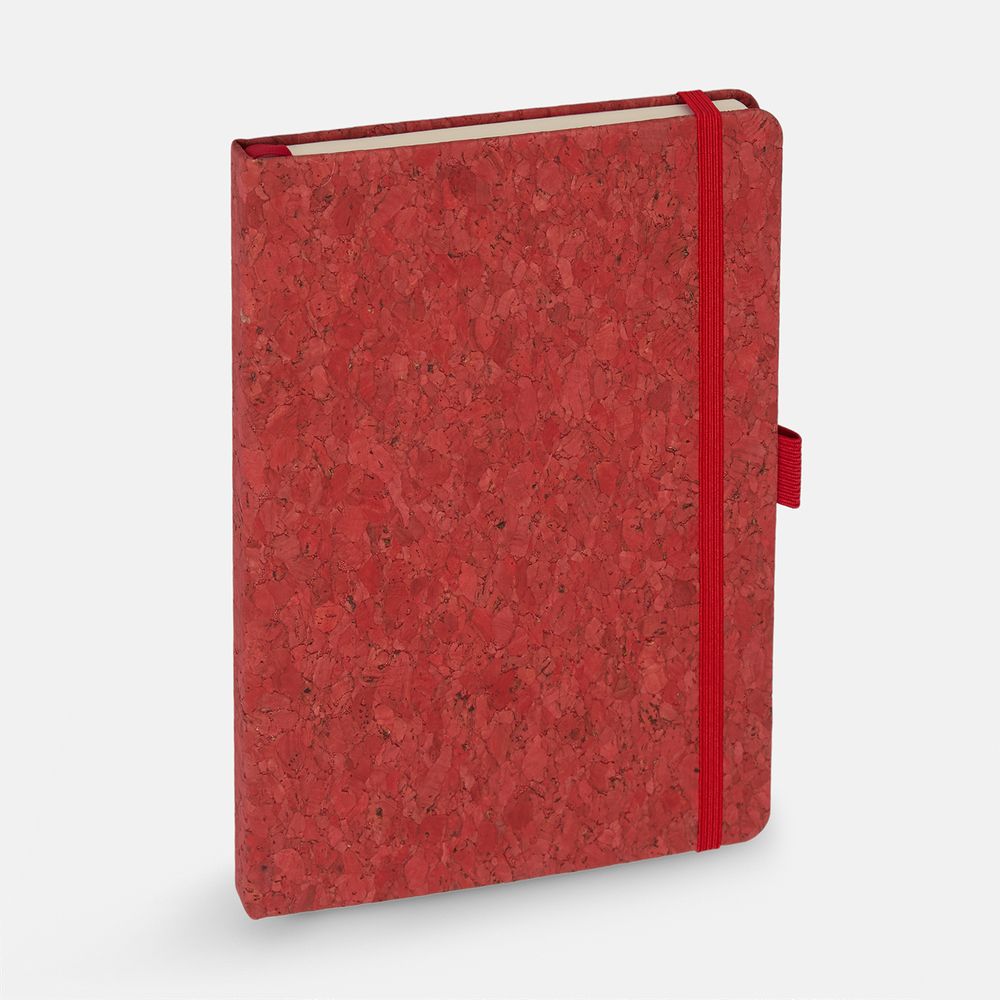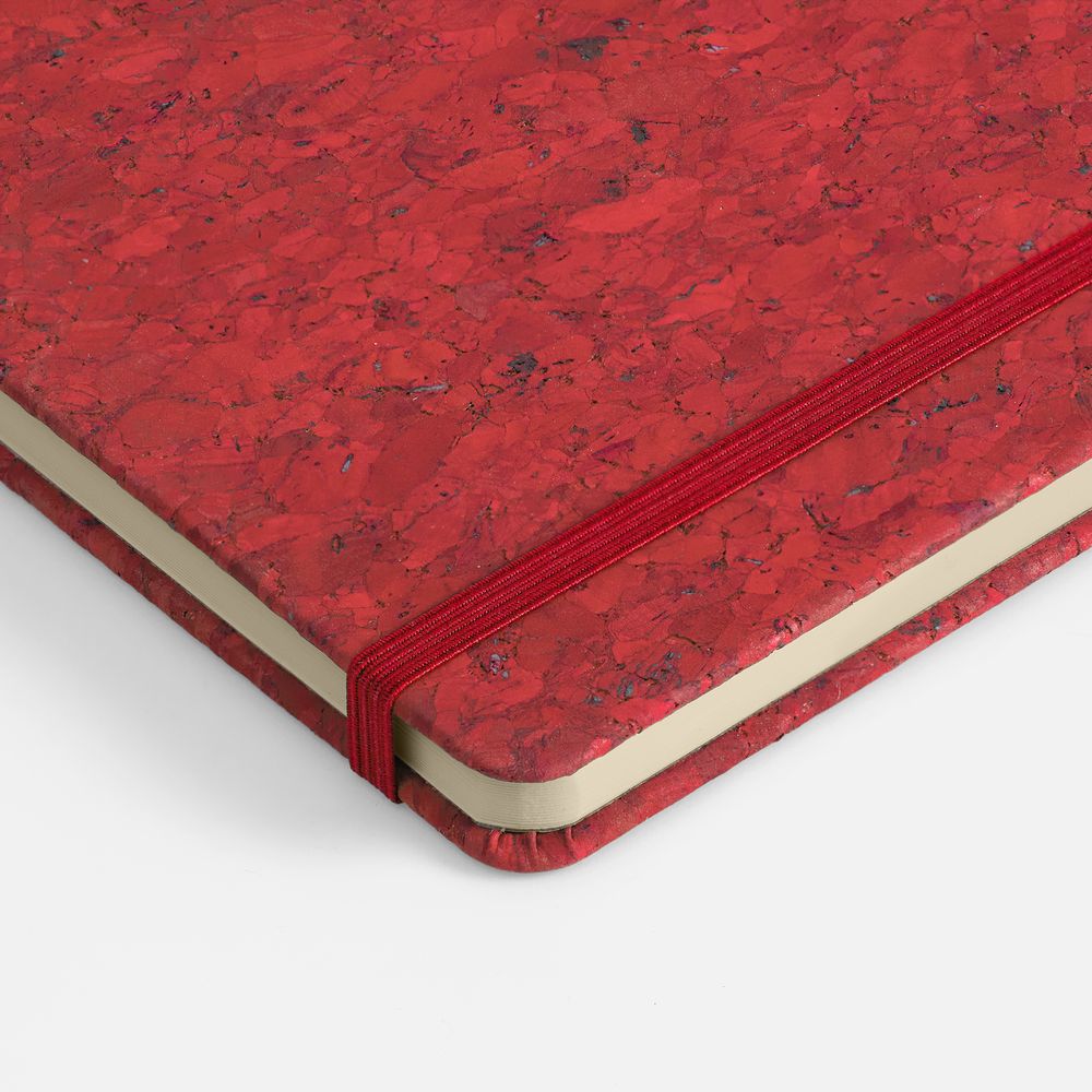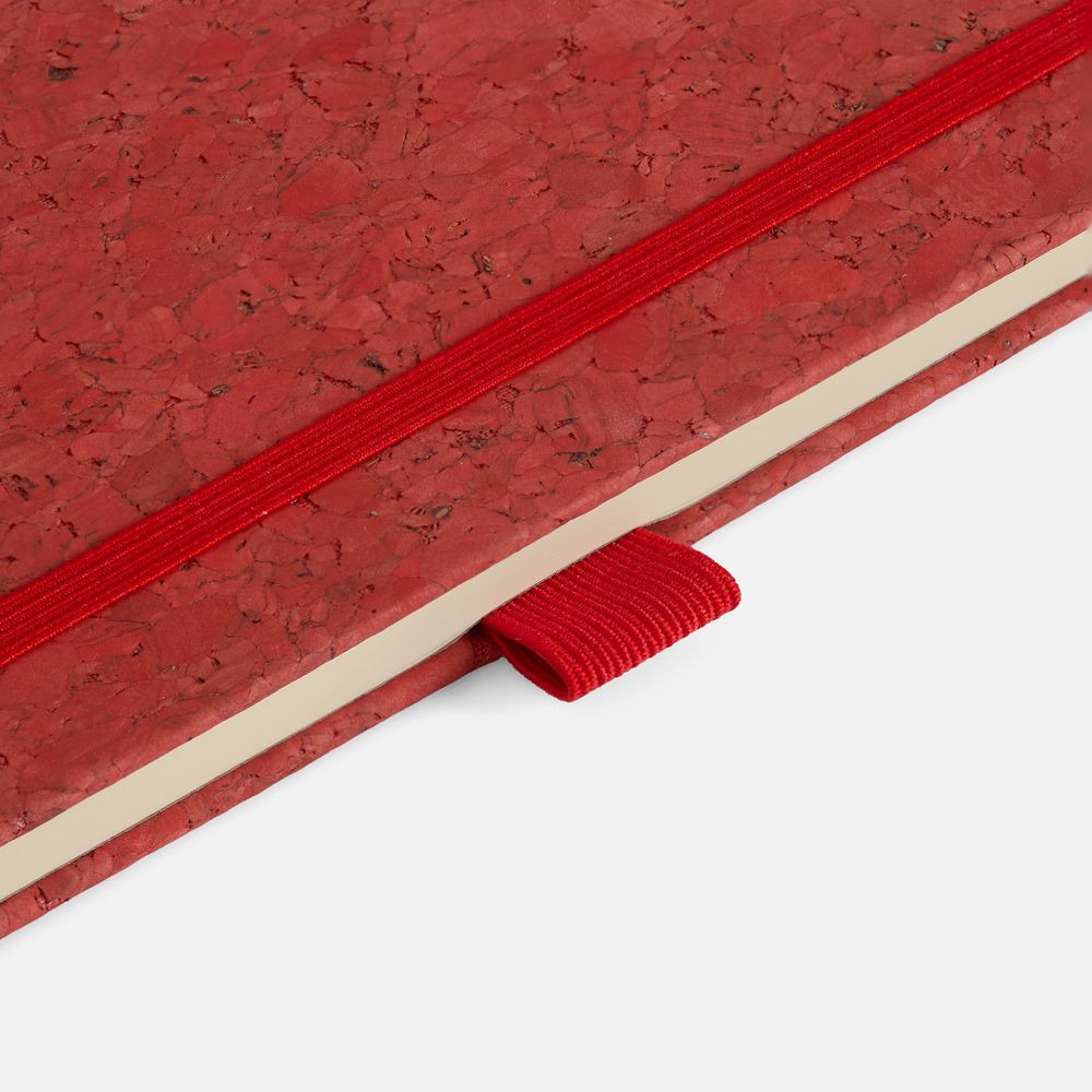 Блокнот с твердой обложкой из натуральной окрашенной пробки, дополнен петлей-резинкой для ручки, ляссе и резинкой в цвет обложки.