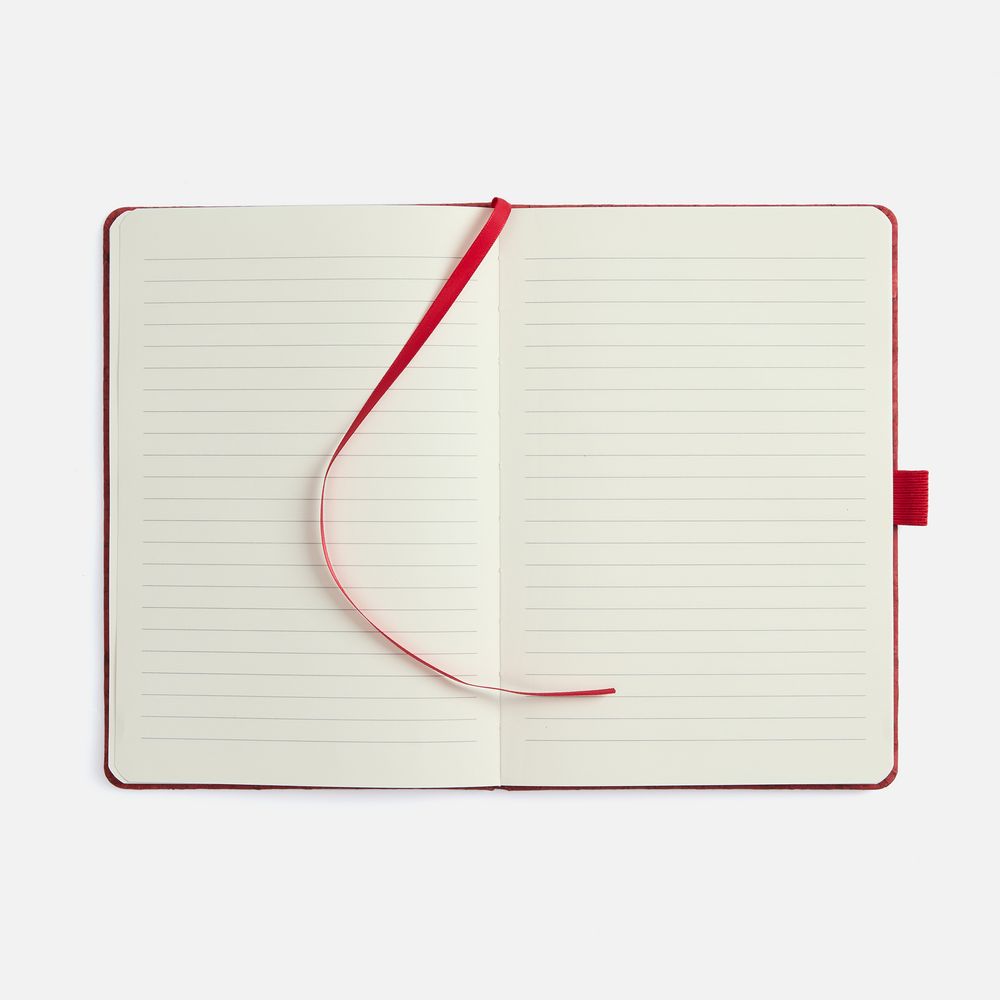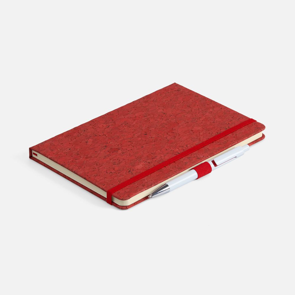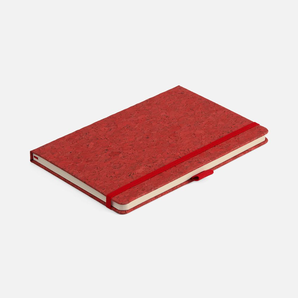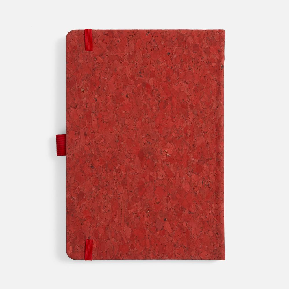 Блокнот с твердой обложкой из натуральной окрашенной пробки, дополнен петлей-резинкой для ручки, ляссе и резинкой в цвет обложки.