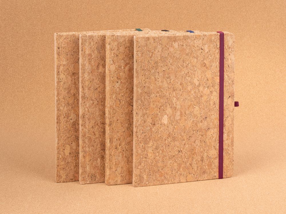 Блокнот в твердой обложке из натуральной неокрашенной пробки, дополнен цветными петлей-резинкой для ручки, ляссе и резинкой на обложку.