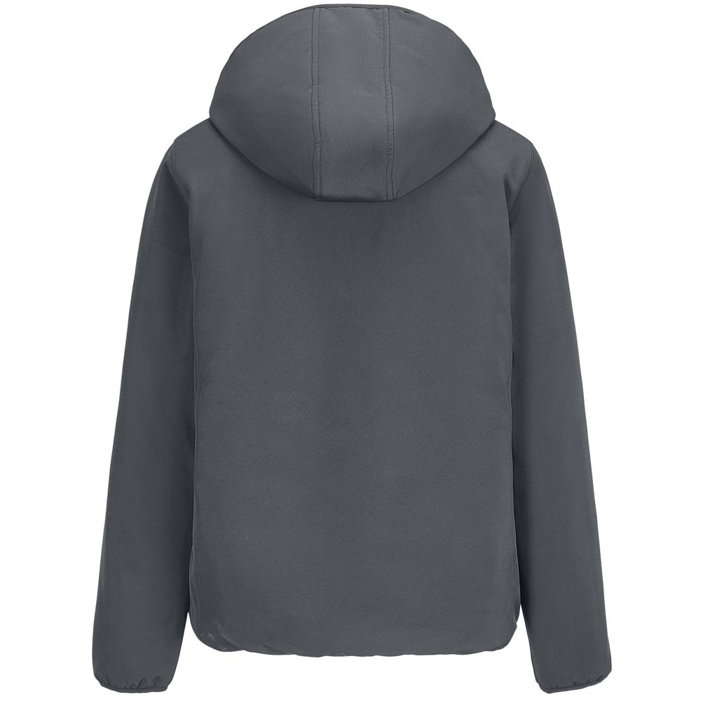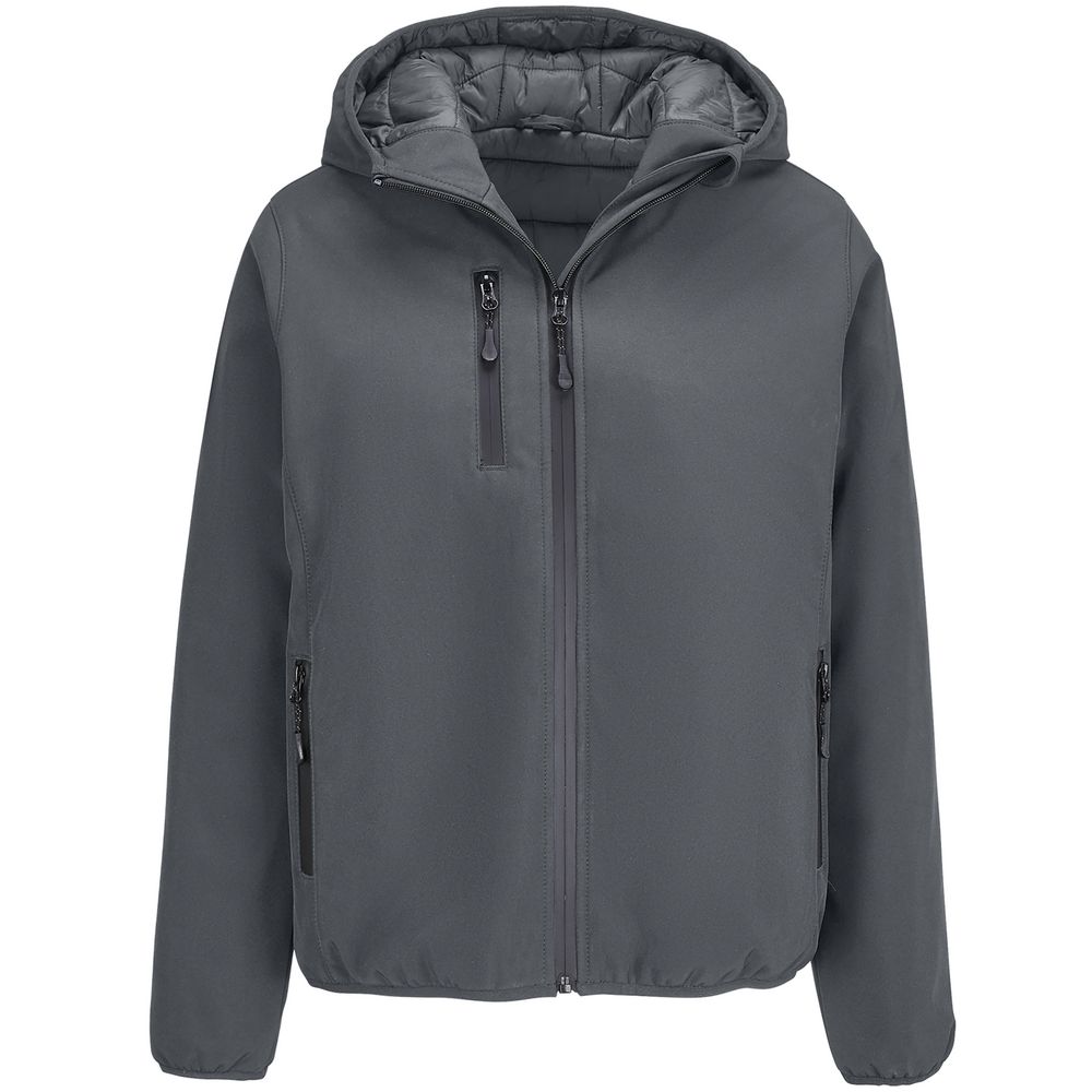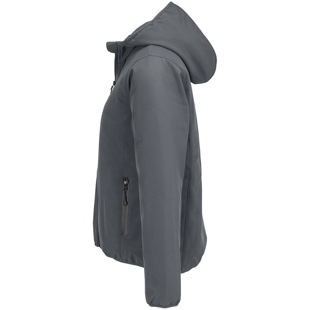 Женская куртка софтшелл на молнии и с капюшоном.