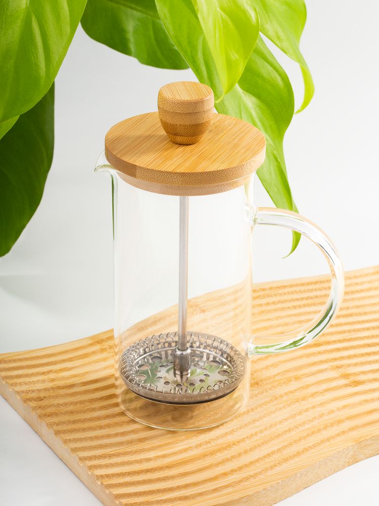 Френч-пресс с изящным сочетанием прозрачного боросиликатного стекла и натурального дерева станет стильным акцентом на кухне.