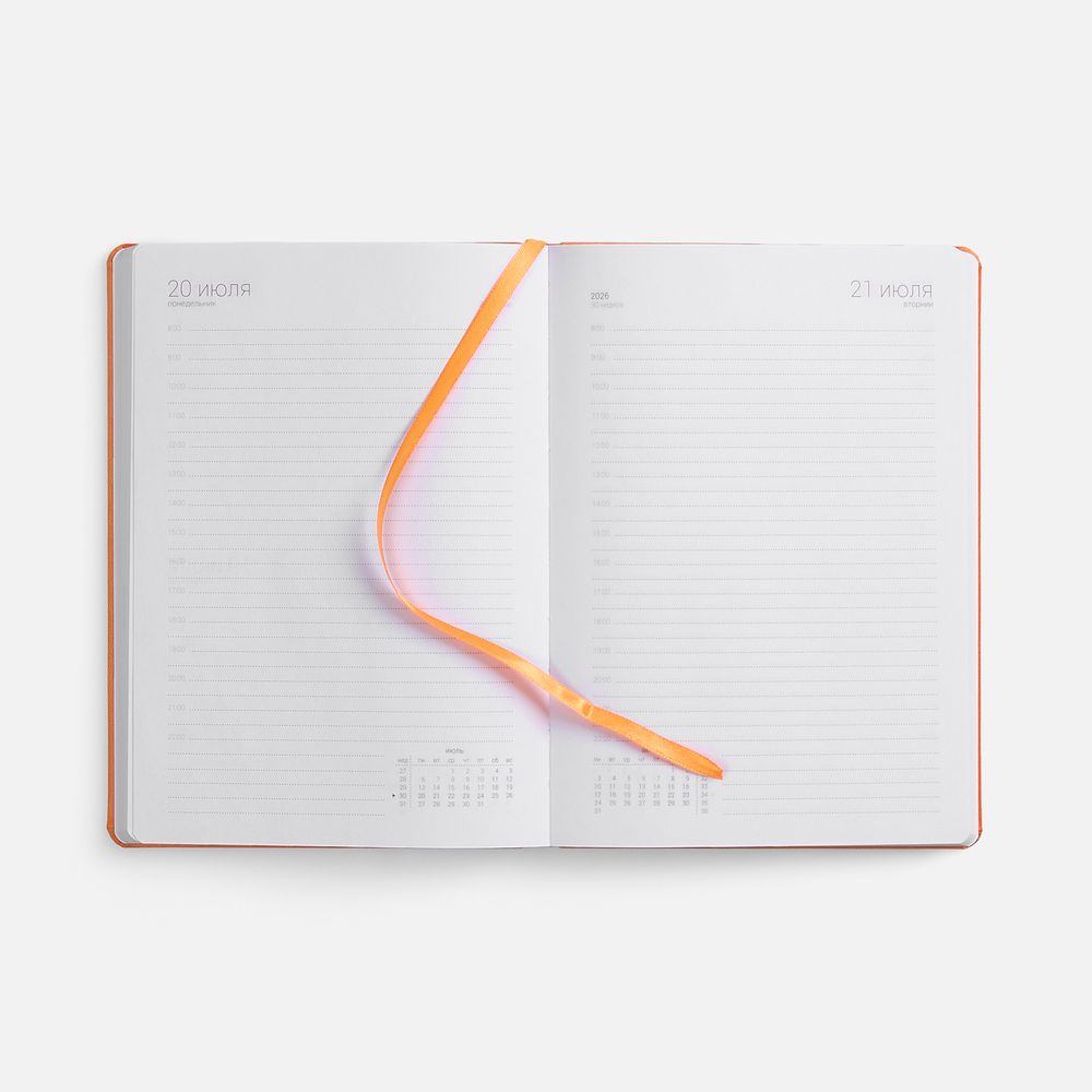 Ежедневник датированный на 2026 год. Ежедневник с твердой обложкой, выполнен из материала Latte, оранжевый ОО, дополнен ляссе в цвет обложки.