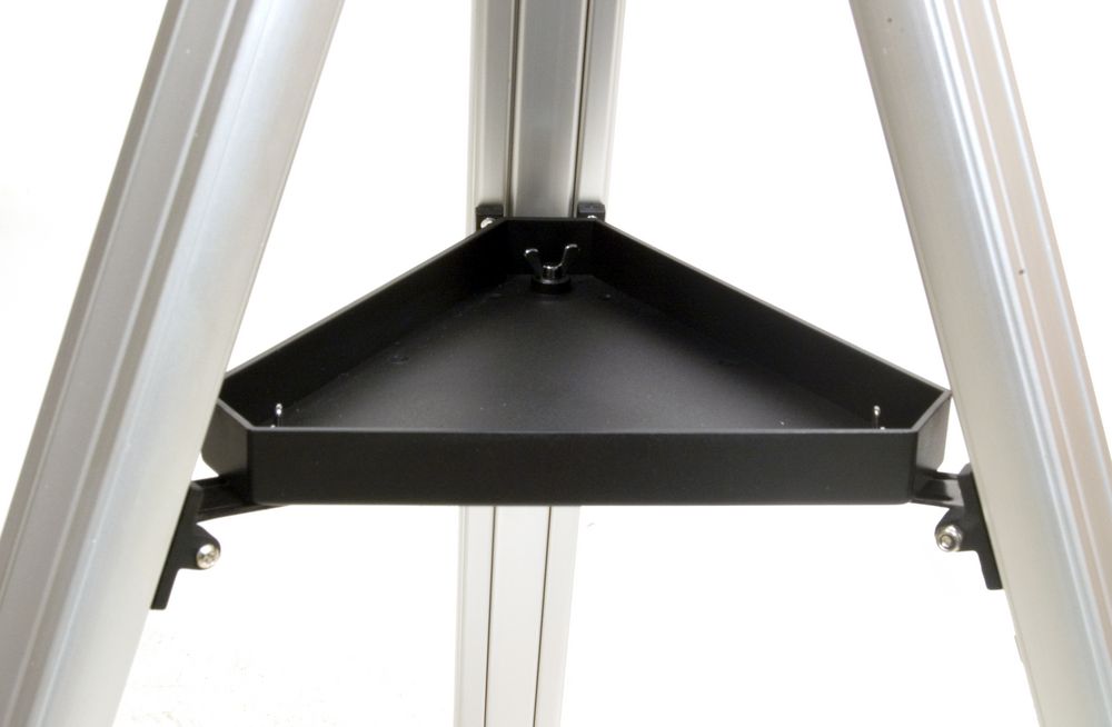Тренога регулируется по высоте и имеет удобную полочку для принадлежностей. На выходной втулке имеется стандартная Т-резьба, которая через дополнительное переходное кольцо позволяет присоединять к телескопу зеркальную фотокамеру и производить съемку Луны и других ярких объектов.В комплект входит лоток для аксессуаров, крепящийся на треногу.