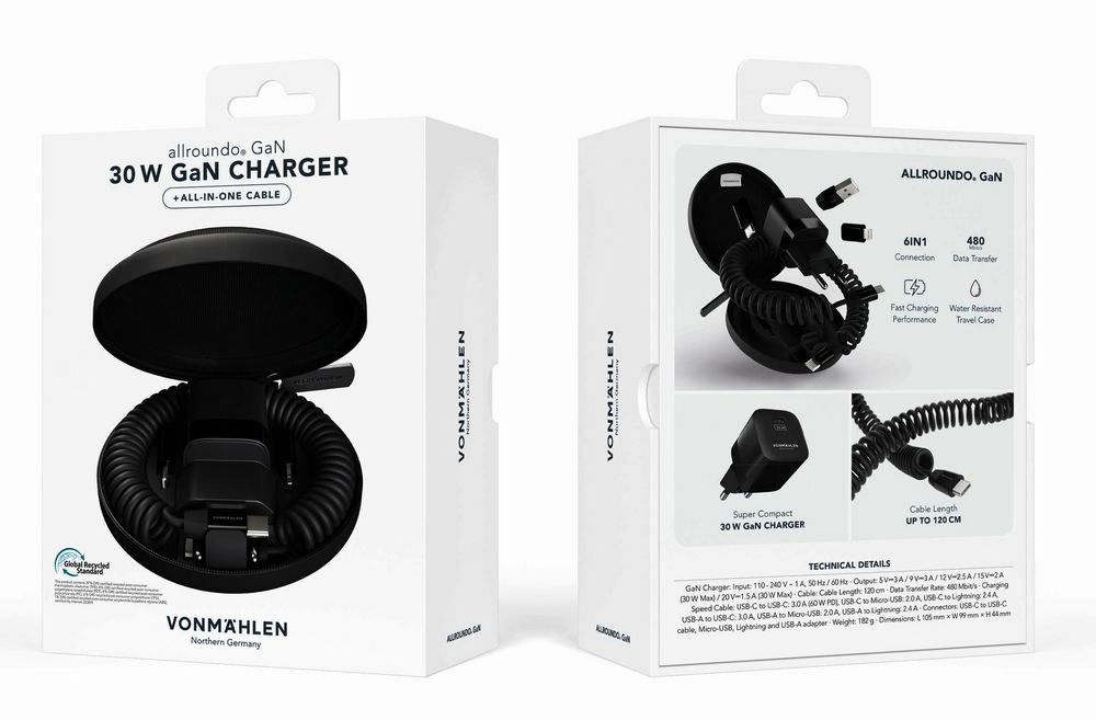 Vonmаhlen Allroundo GaN — это компактный и удобный в использовании аксессуар, сочетающий в себе зарядное устройство мощностью 30 Вт и многофункциональный кабель с переходниками для удобной зарядки самых разных устройств. Комплект переходников позволяет создать до 6 разных конфигураций зарядного кабеля, что делает его по-настоящему универсальным.