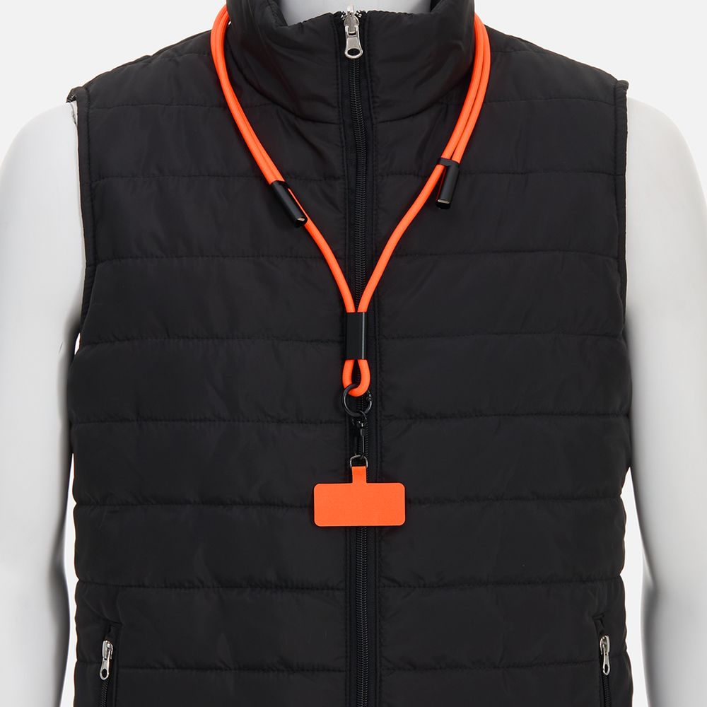 Важно: Для крепления телефона на ланьярд телефон должен иметь чехол. Если ланьярд распускается под тяжестью смартфона, убедитесь, что среднее из трех колец фурнитуры находится по центру ланьярда (на шее под затылком), а не сбоку. Соседние ветви оплетки должны идти вместе, без зазоров, так достигается трение ткани о ткань. Слишком тяжелые смартфоны (диагональ 6,9" и более) могут распускать ланьярд при энергичных движениях.