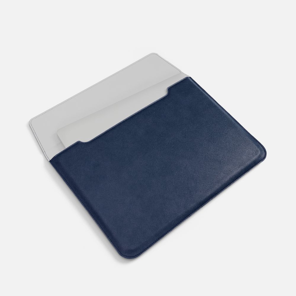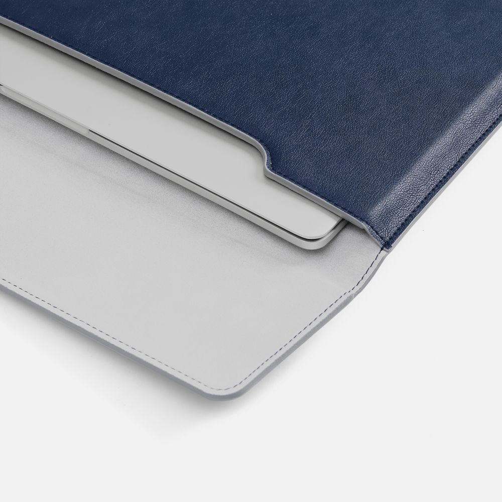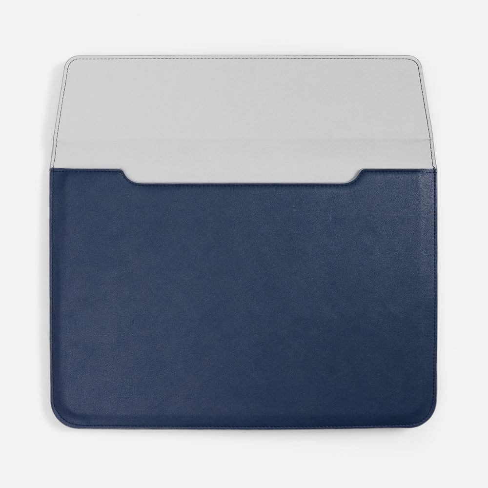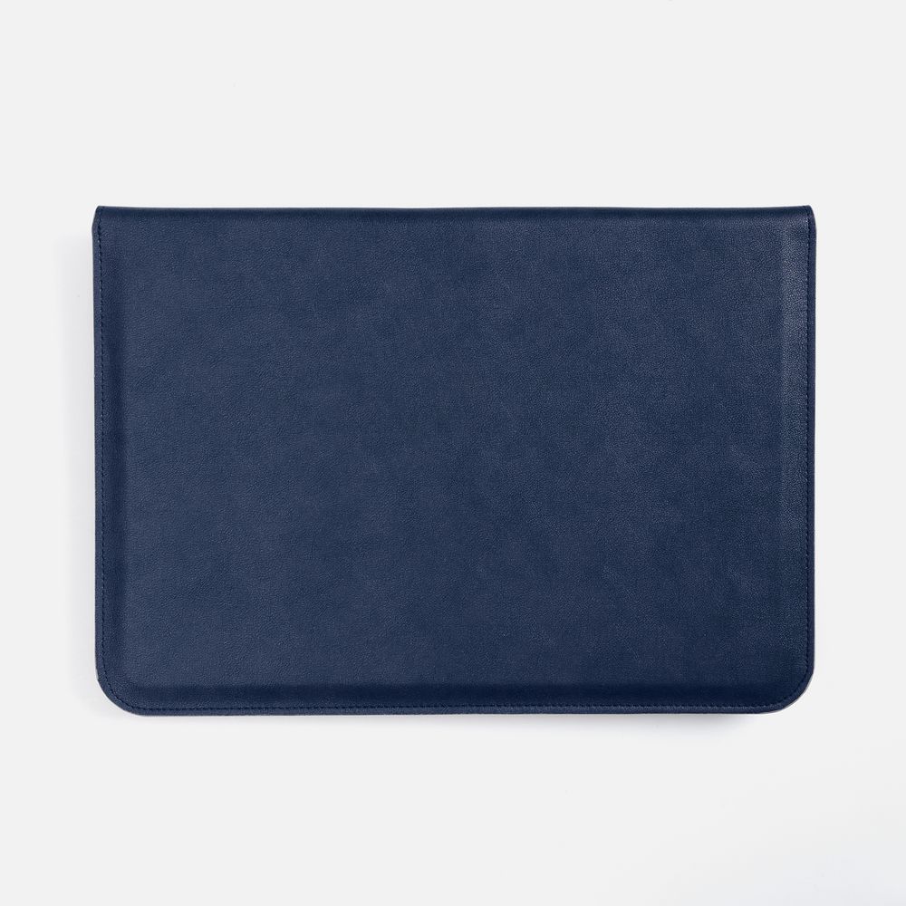Чехол для ноутбука с диагональю до 15,6 выполнен из материала Petrus, синего цвета, дополнен окрашенным срезом края серого цвета. Можно использовать в качестве папки для бумаг. Клапан на магните.