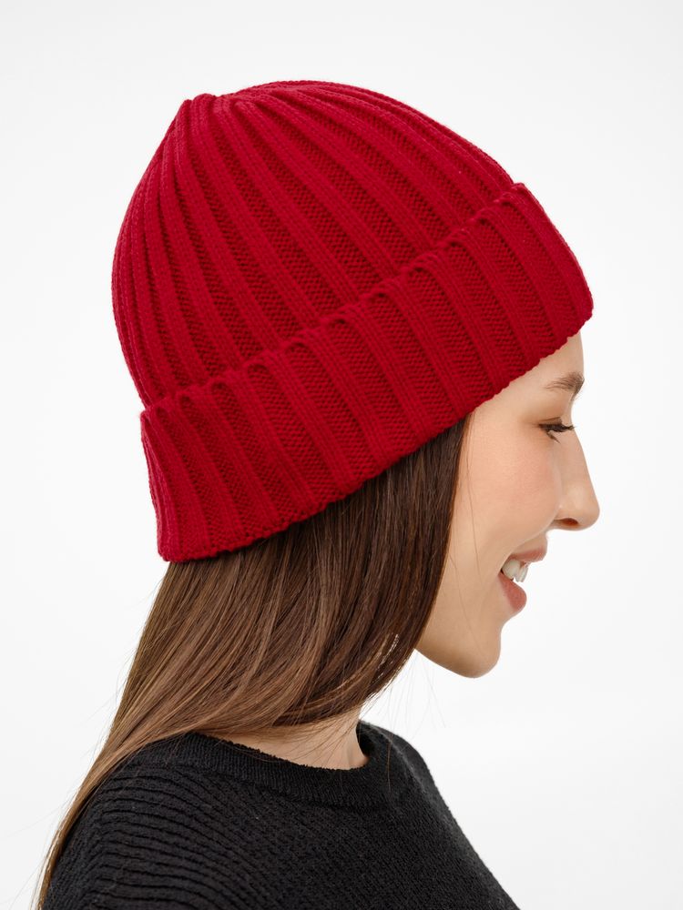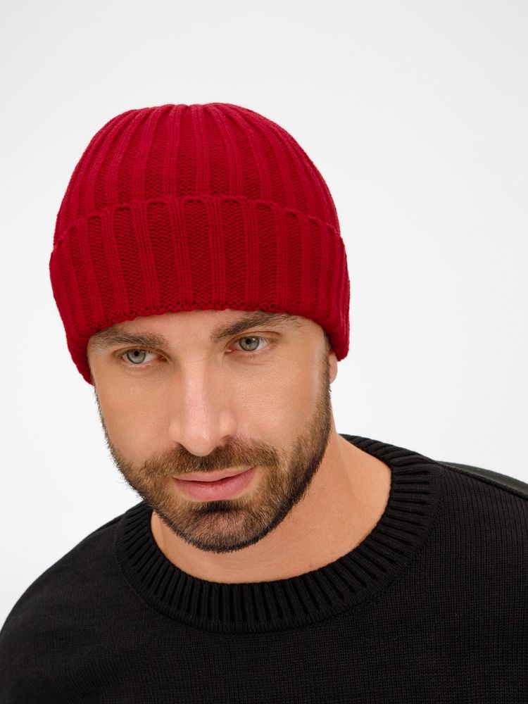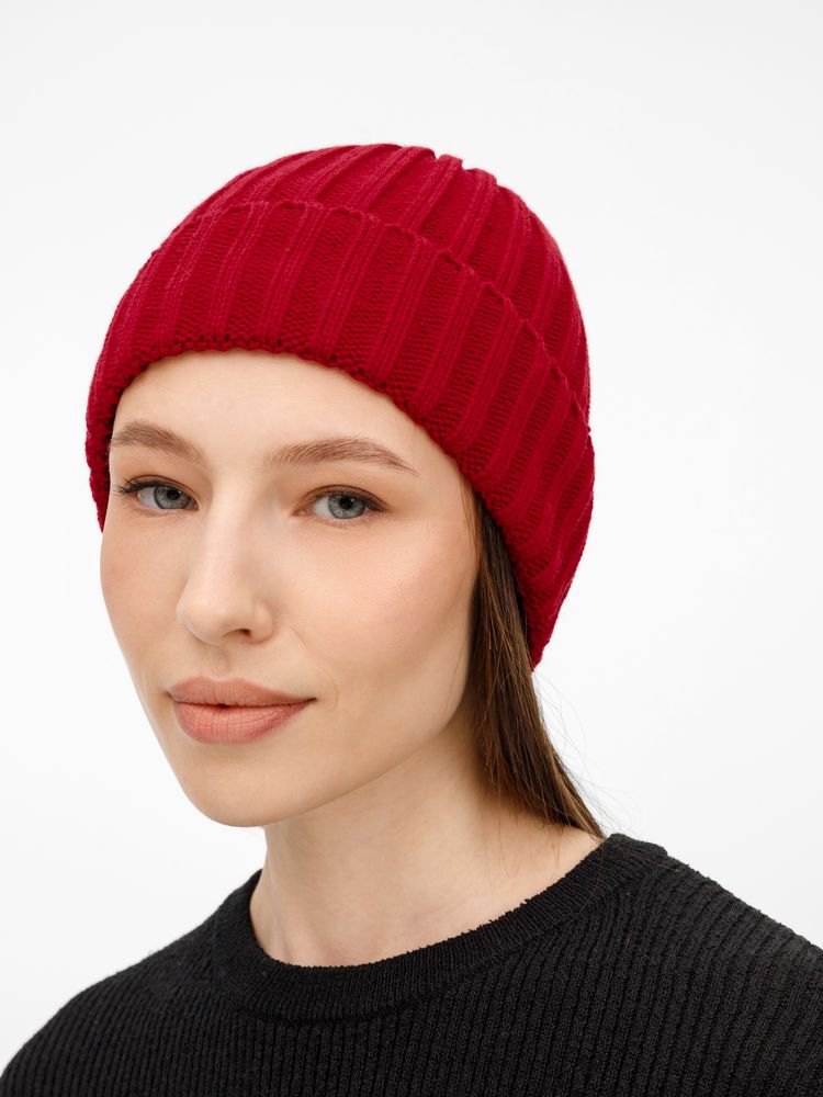 Однослойная шапка рельефной вязки с отворотом.