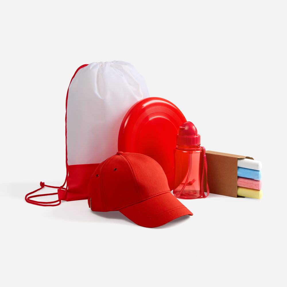 • Материал: картон; бутылка, тарелка - пластик; бейсболка - хлопок 100%, плотность 260 г/м²; рюкзак - полиэстер 100%, 210D