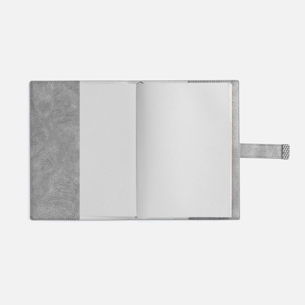 Ежедневник в мягком переплете со съемной обложкой, дополнен застежкой-хлястиком с металлическим шильдом на кнопке, двойным ляссе и капталом.