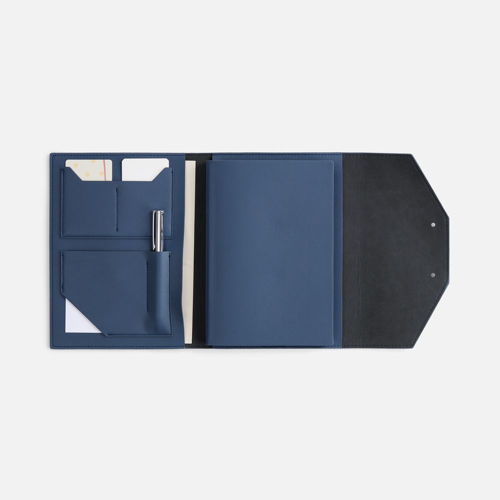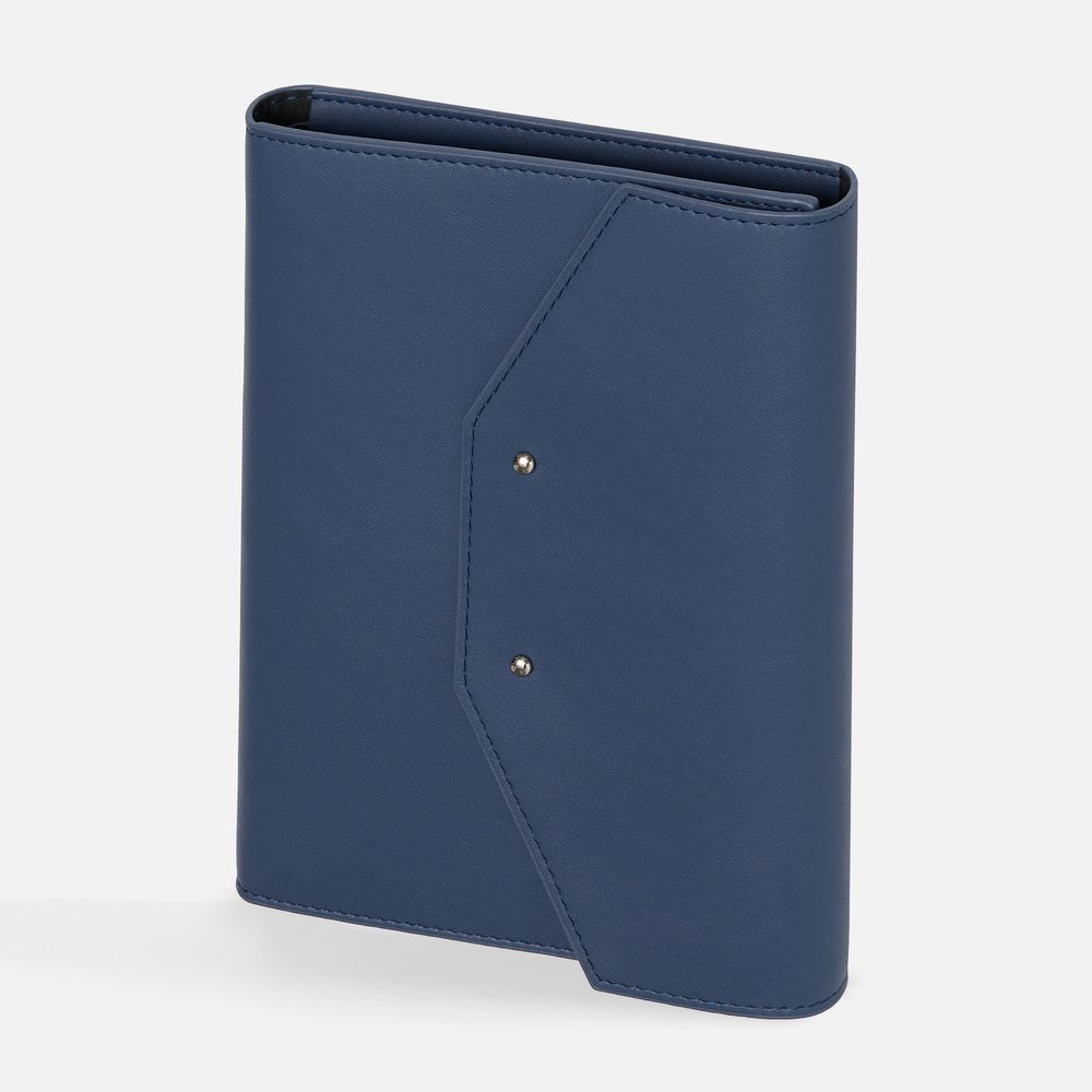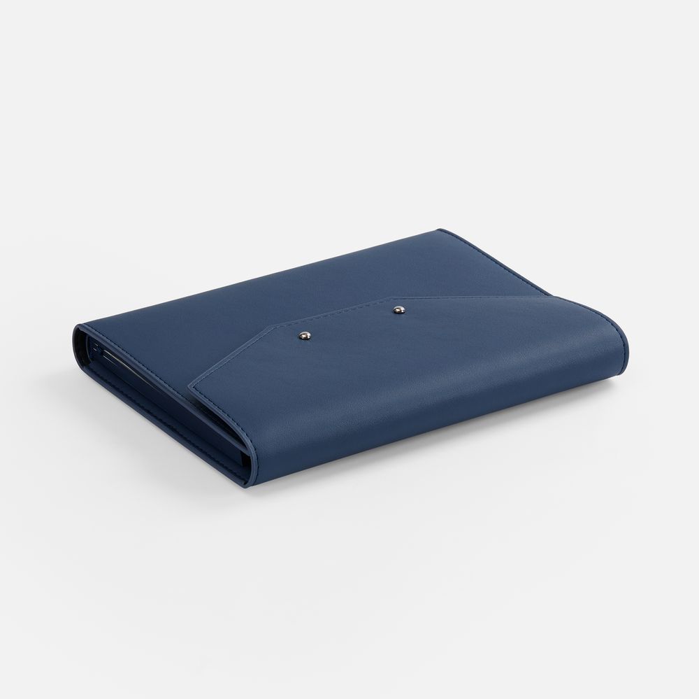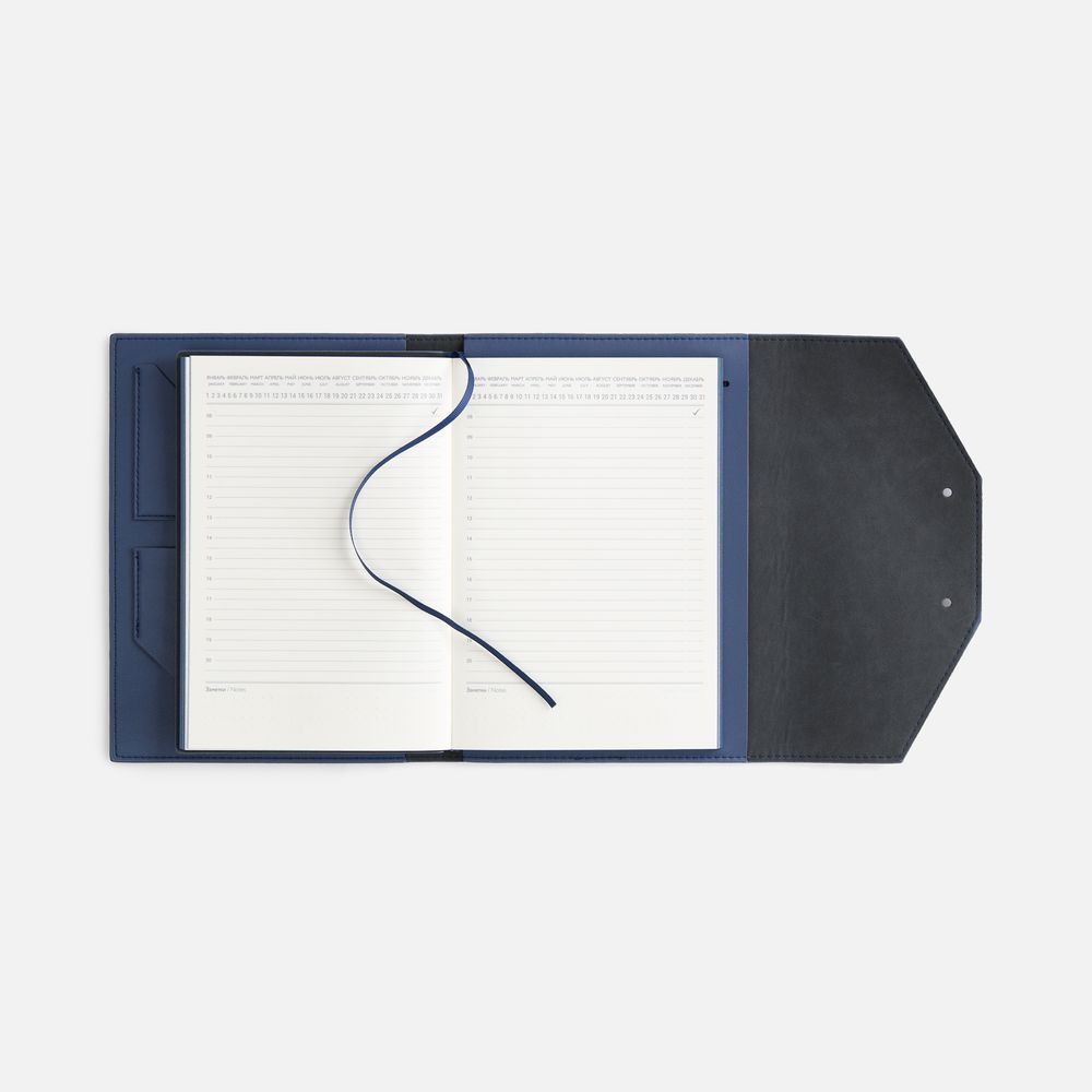 Ежедневник-органайзер в мягком переплете, формат А5+, с карманами для визиток и документов, петлей для ручки. Дополнен ляссе и капталом в цвет обложки. Клапан с прорезями застегивается на кобурные металлические кнопки.