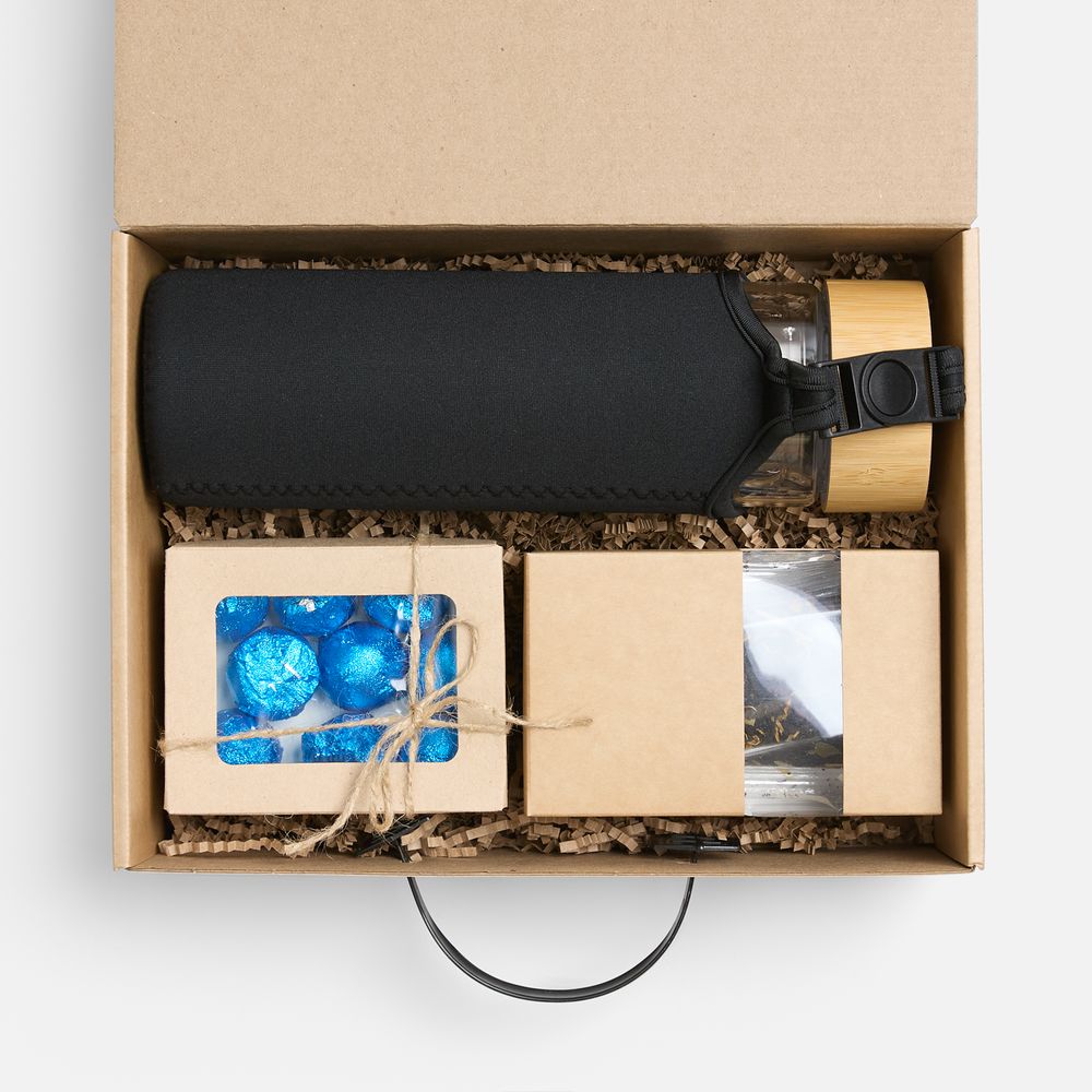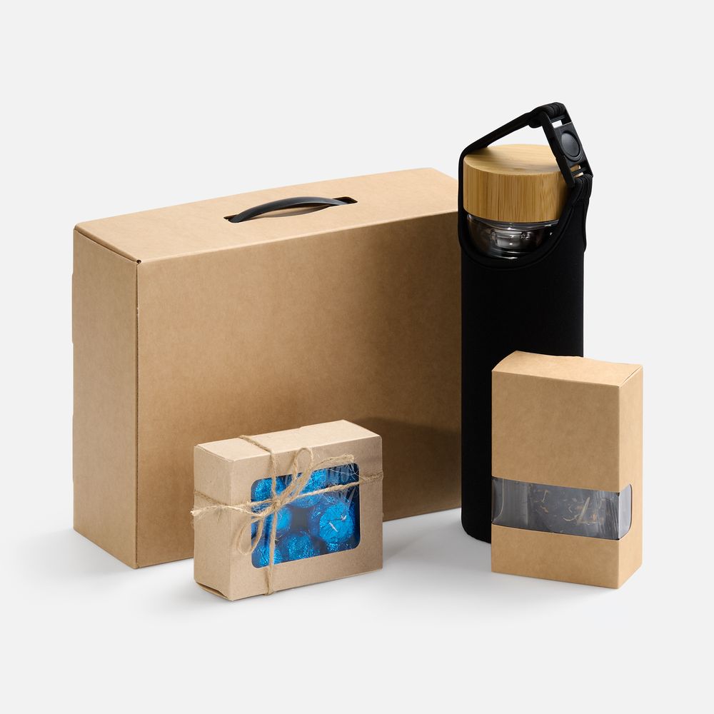 • Материал: бутылка - боросиликатное стекло, нержавеющая сталь, бамбук, неопрен; коробка - картон, пластик